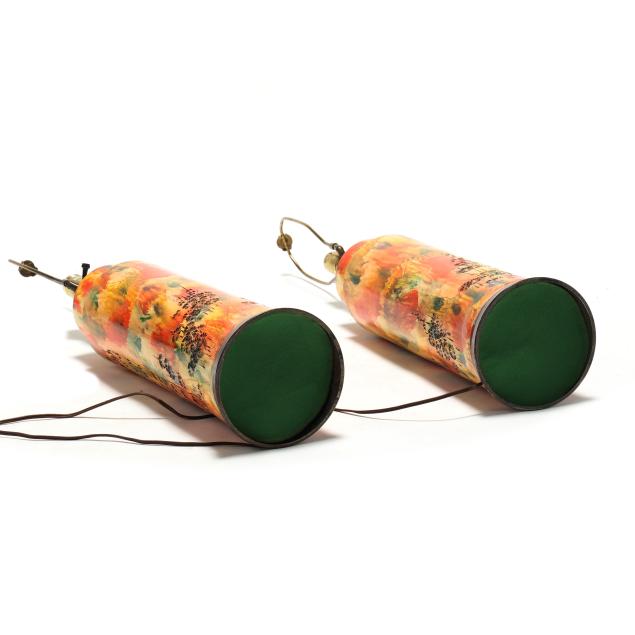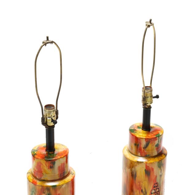 Good condition; ceramic undersides hollow; some paint loss to metal bases; later shades without finials.