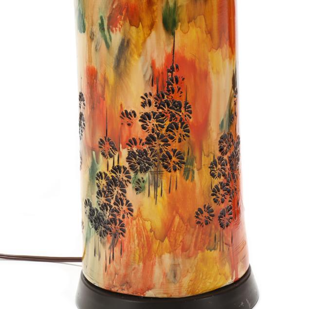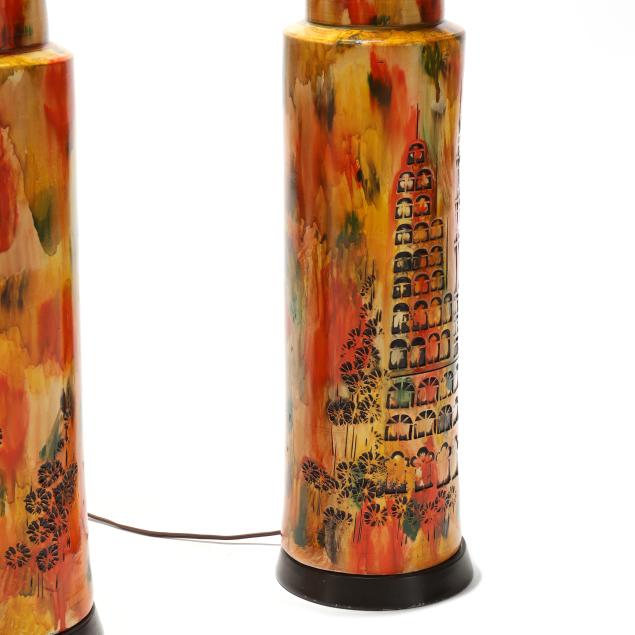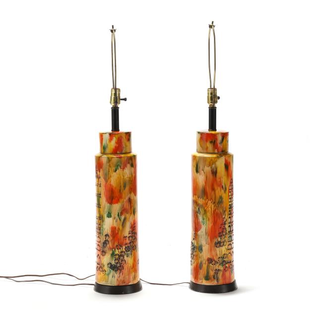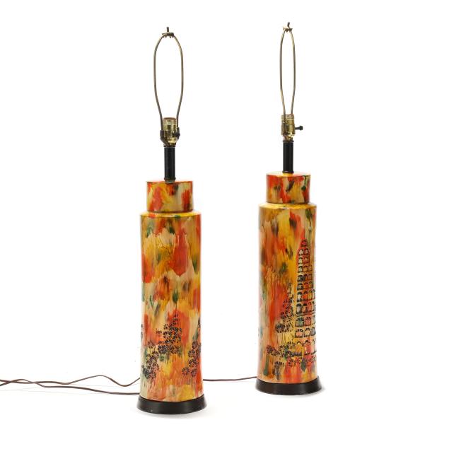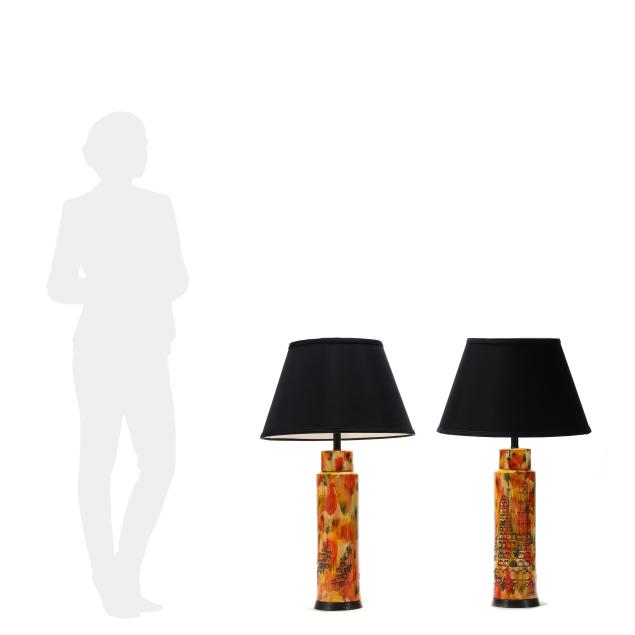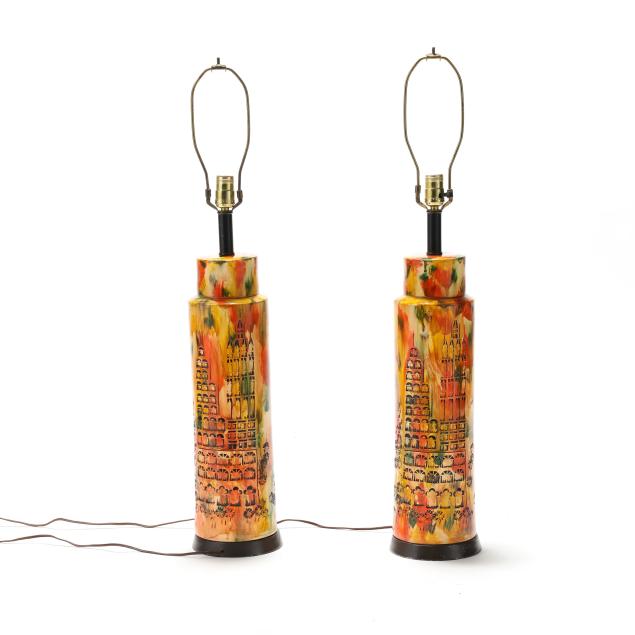 Circa 1970, for Bitossi, appears unsigned, impressed cityscape motifs with yellow, orange, and green splash glaze, single socket fixture and painted metal base, includes shades.