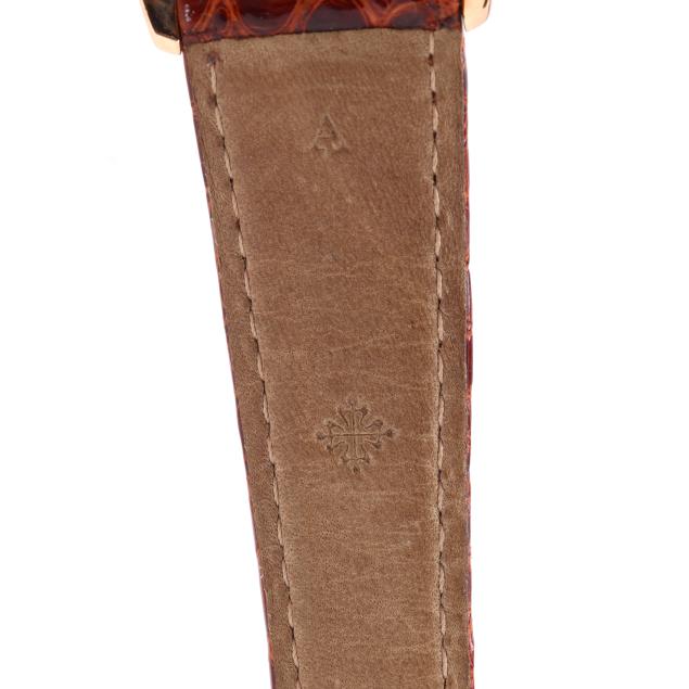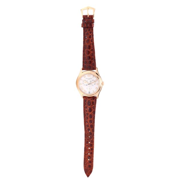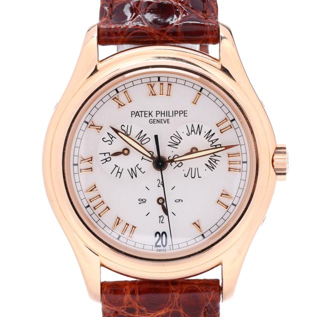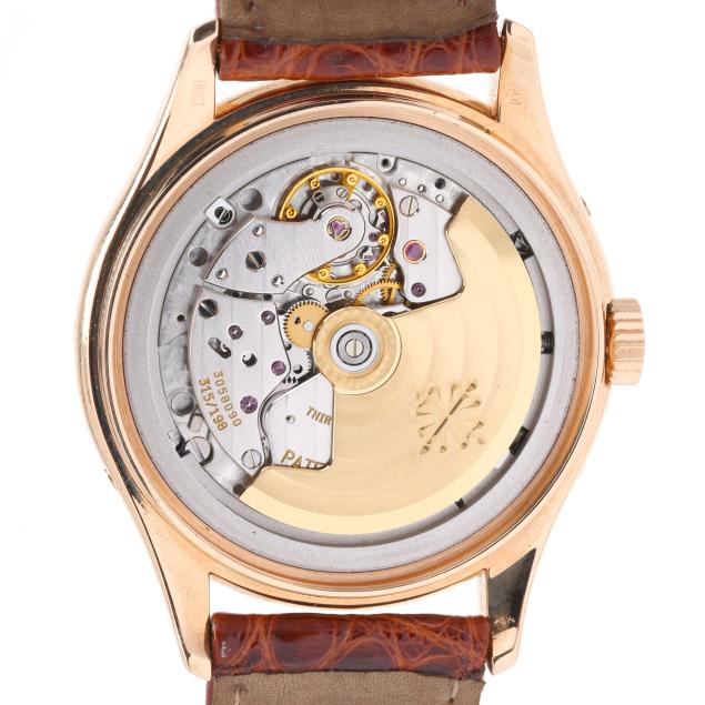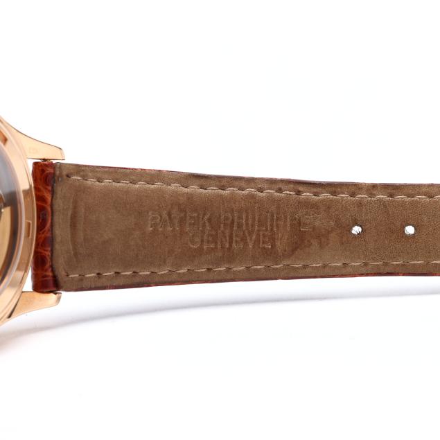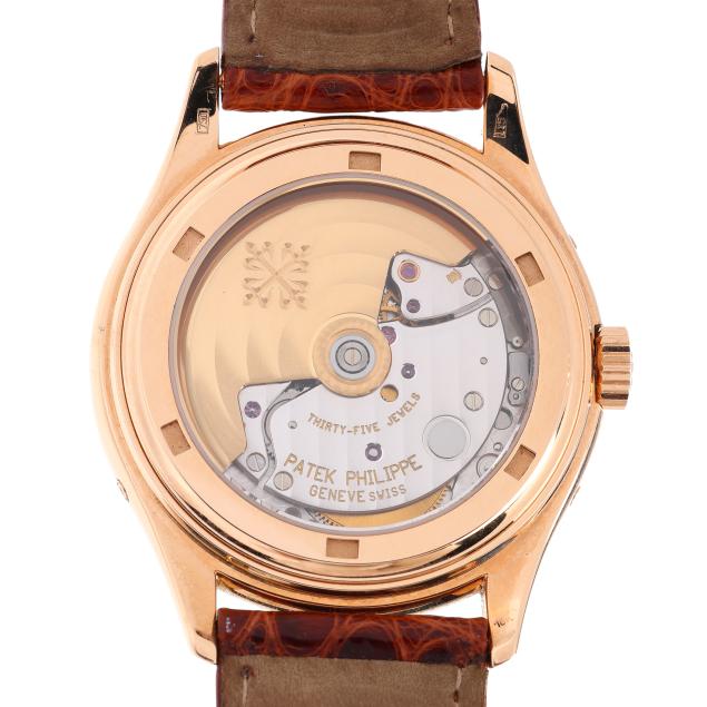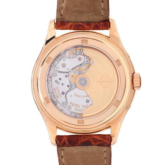 Automatic, Patek Philippe 315/190, reference number 5035, case number 4033083, movement number 3058090, the round rose gold case with polished bezel and Swiss hallmarks for 18KT, the signed silver dial with luminescent rose gold Roman numeral hour markers, luminescent rose gold leaf hands, subsidiary calendar dials at 2:00 and 10:00 hours, and subsidiary 24-hour dial and date window at 6:00 hour, the signed brown textured leather strap completed with signed rose gold buckle with Swiss hallmarks for 18KT, the exhibition caseback numbered and with Swiss hallmarks for 18KT to interior.