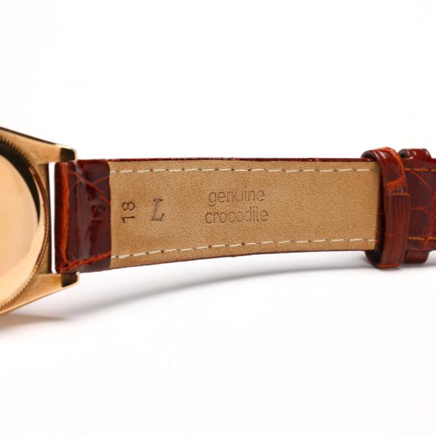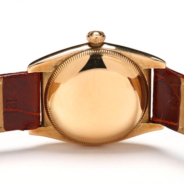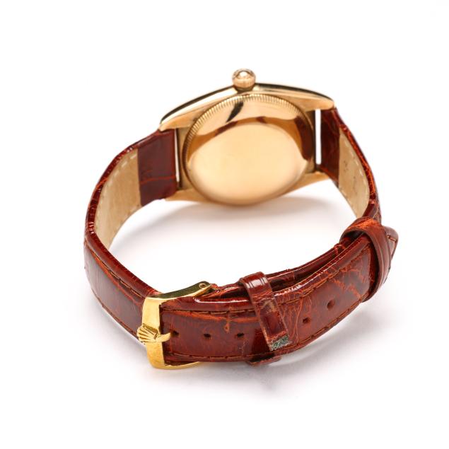 Circa 1946, automatic, reference number 3130, serial number 443973, the gold three-piece Oyster case with polished gold bezel and Swiss hallmark for 14KT, the signed silver dial with gold Roman numeral hour markers, gold sword hands, and subsidiary second dial at 6:00 hour, the brown textured leather strap completed with gold buckle stamped and testing 18KT, the signed gold caseback interior marked 0.585-14K.