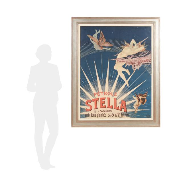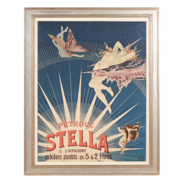 Private Collection, Richmond, Virginia In this luminous 1897 advertisement for Pétrole Stella, Henri Boulanger casts a trio of celestial figures as ethereal muses, gracefully bearing lamps lit by the product’s radiant flame. Floating in a starlit sky, they evoke a dreamlike serenity that transforms a utilitarian fuel into a symbol of divine illumination.