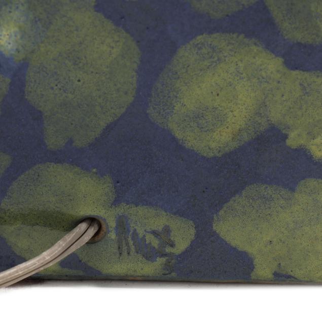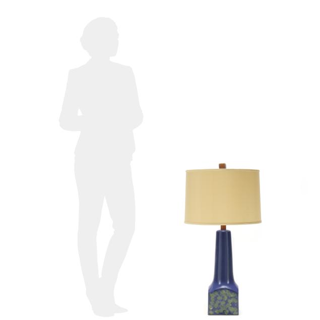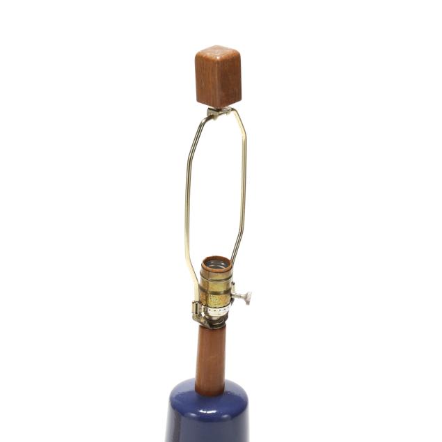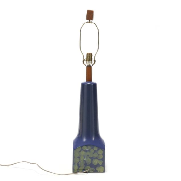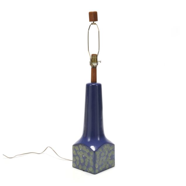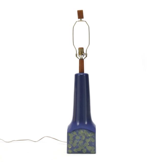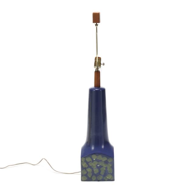 For Marshall Studios, Veedersburg, Indiana, active 1952-1980s, tapering cone atop a cube base decorated with layered green patterns on a king's blue ground, signed "Martz" to the verso, single socket fixture mounted with walnut standard and finial, includes shade.