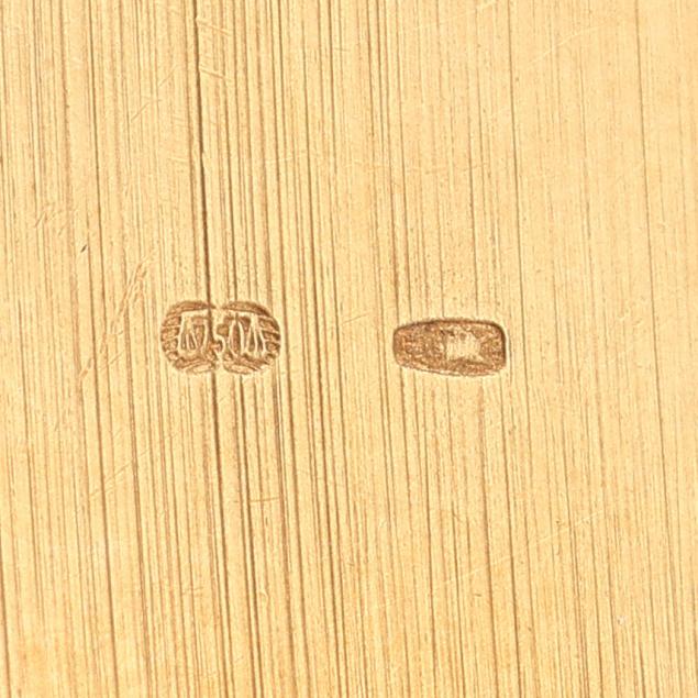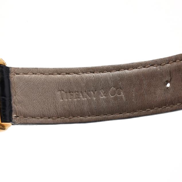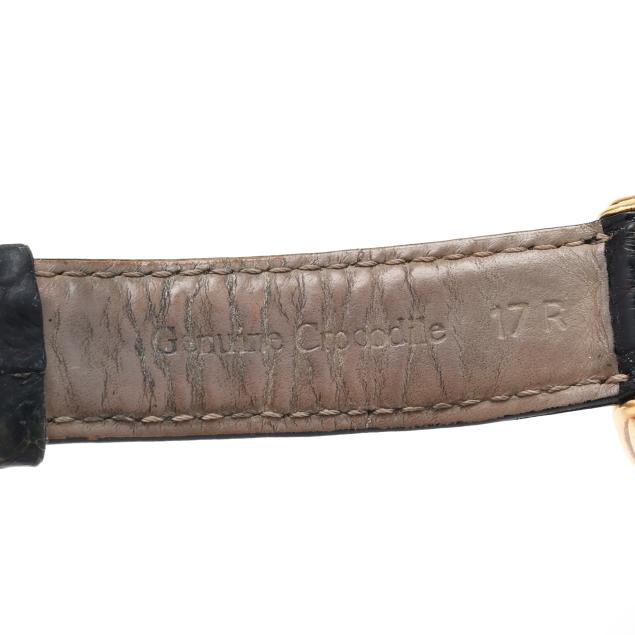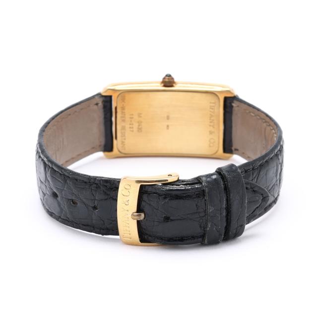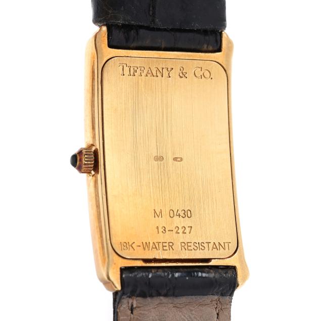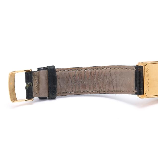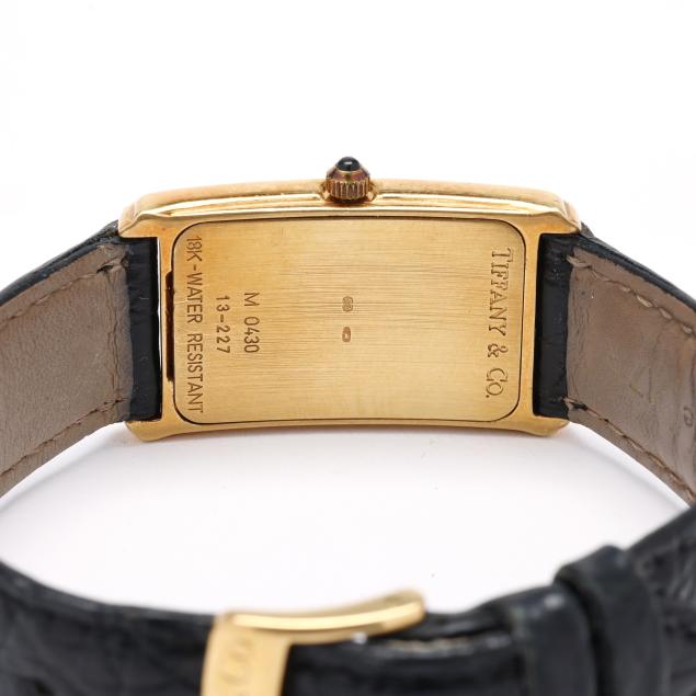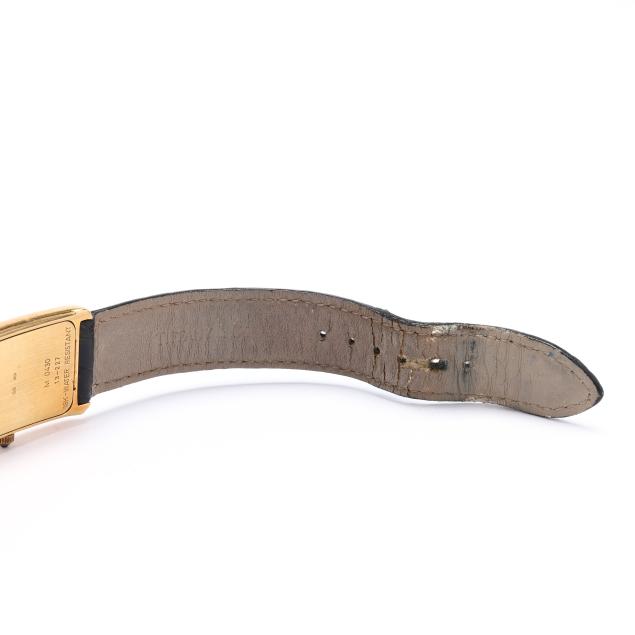 Quartz, ETA 976.001, reference number M0430, serial number 13-227, the rectangular gold tank case with signed white dial, black Roman numeral hour markers, and black stick hands, the signed black textured leather strap marked Genuine Crocodile and completed with signed gold-tone buckle, the signed caseback numbered M0430 / 13-227 and with Swiss hallmarks for 18KT.