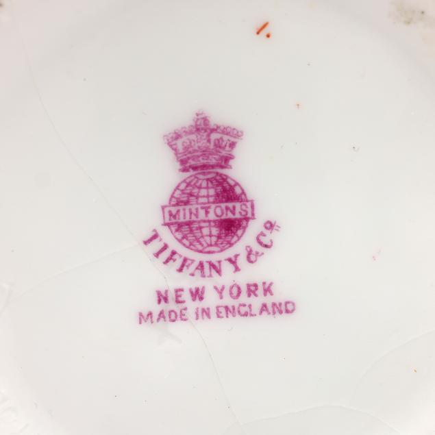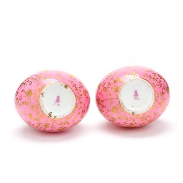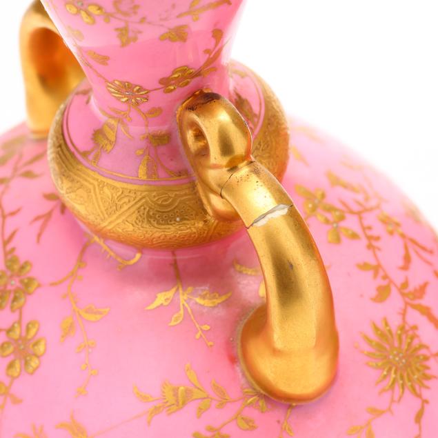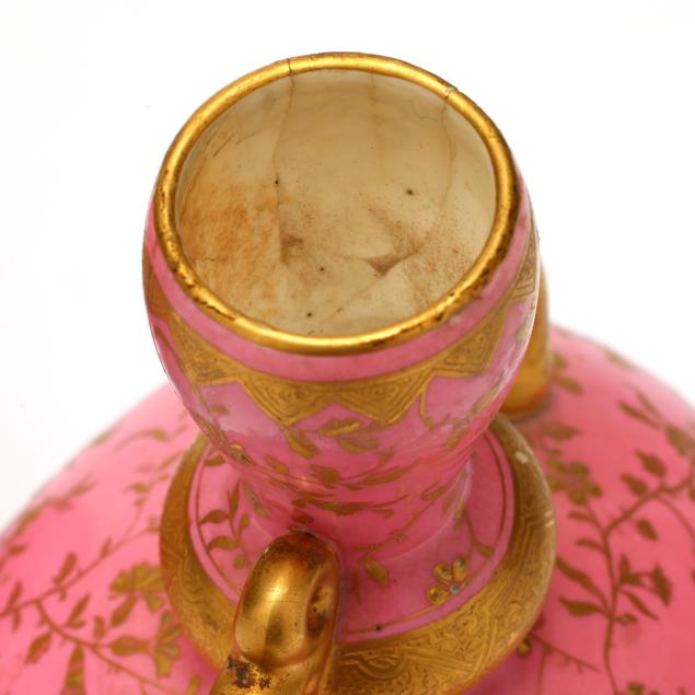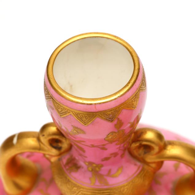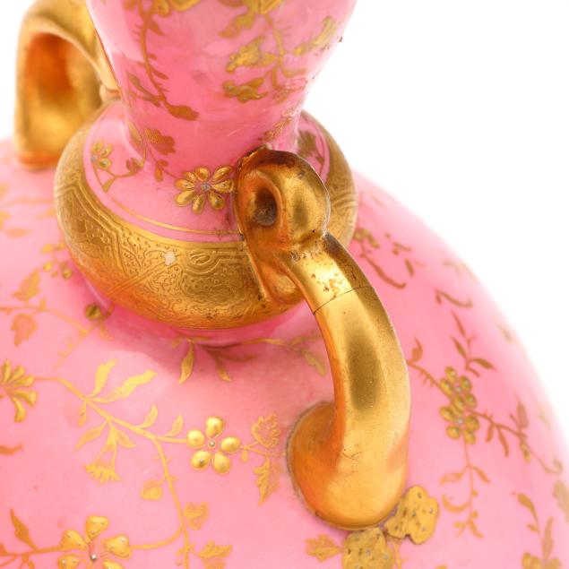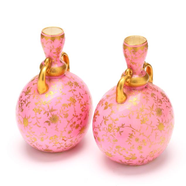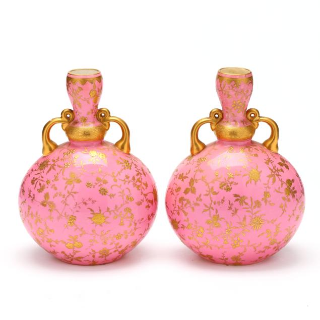 Made in England, early 20th century, porcelain dual handled moon flasks with pink ground, gilt handles, and gold encrusted floral and geometric ornamentation, marked with Minton and Tiffany & Co. backstamp to undersides.
