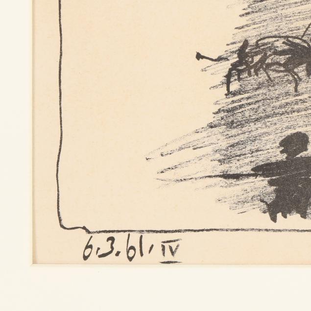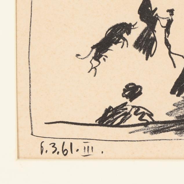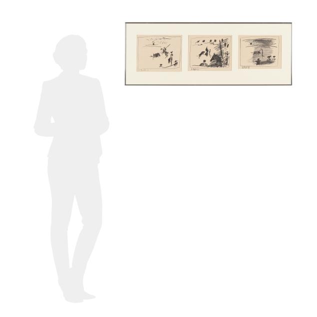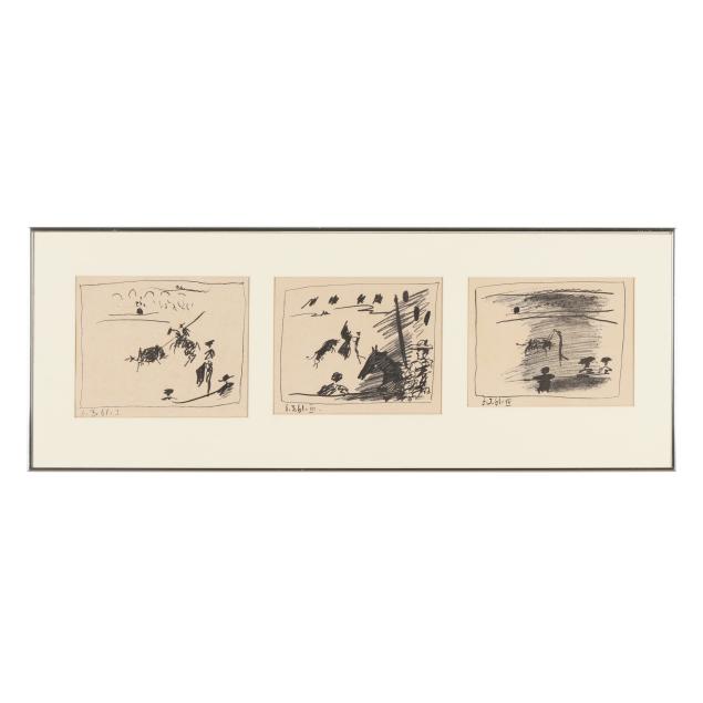 Picasso: Toreros, printed by Mourlot Frères, presented in a triptych frame together below glass; the lot also accompanied by book from which the lithographs were pulled (book not complete): Picasso; Jaime Sabartés; Patrick Gregory (trans.).