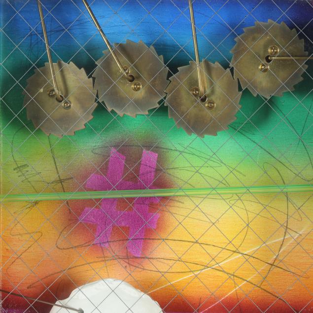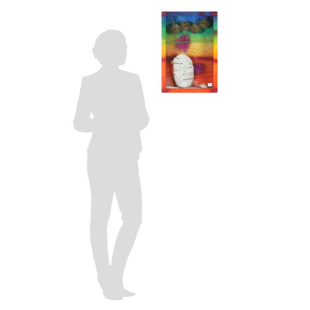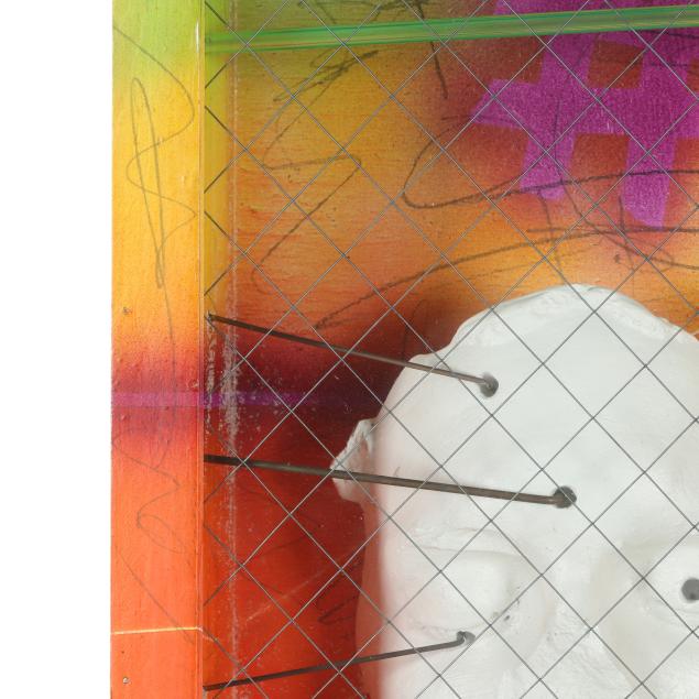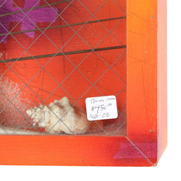 1980, sculptural assemblage, comprised of wood, glass, plaster, acrylic, metal, sand and shell, polychrome, and graphite, the posterior ink signed and dated, bracketed for wall display.