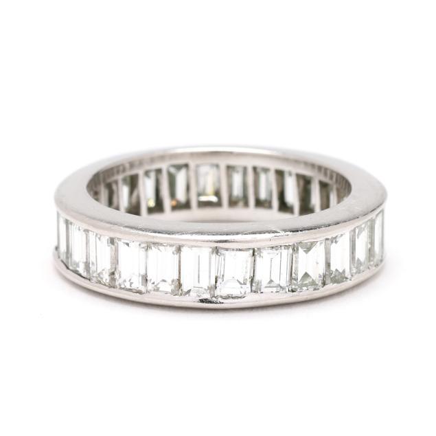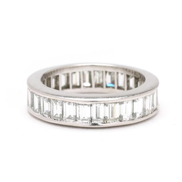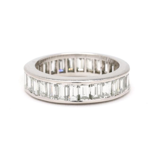 Channel set with emerald cut diamonds weighing approximately 4.00 total carats (H-I color, VS1-VS2 clarity), testing platinum.