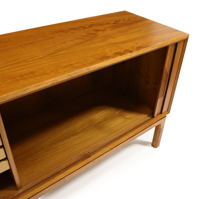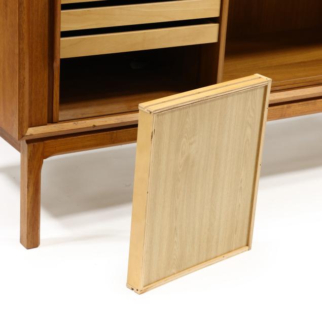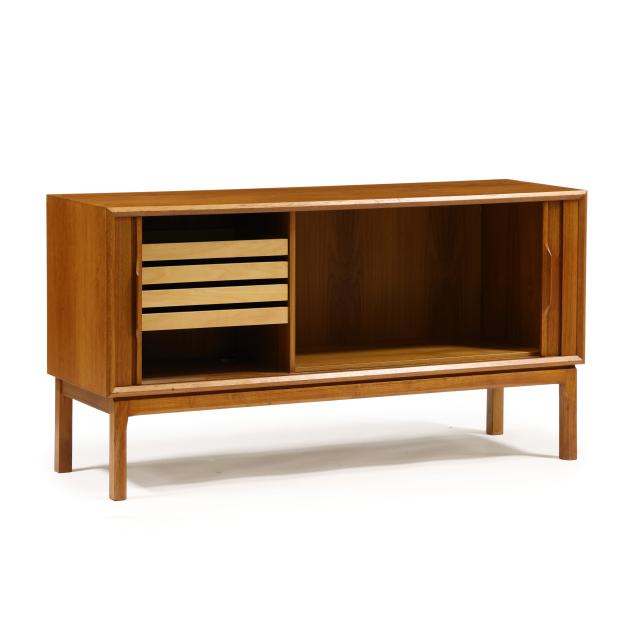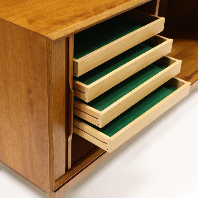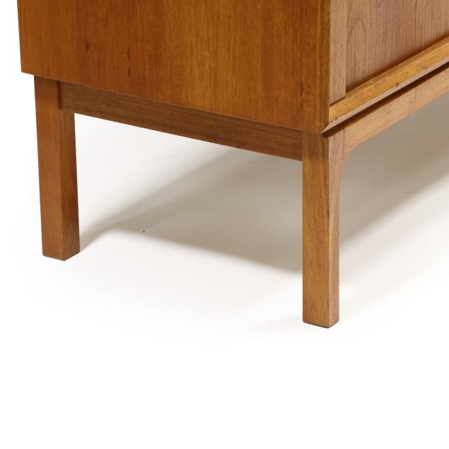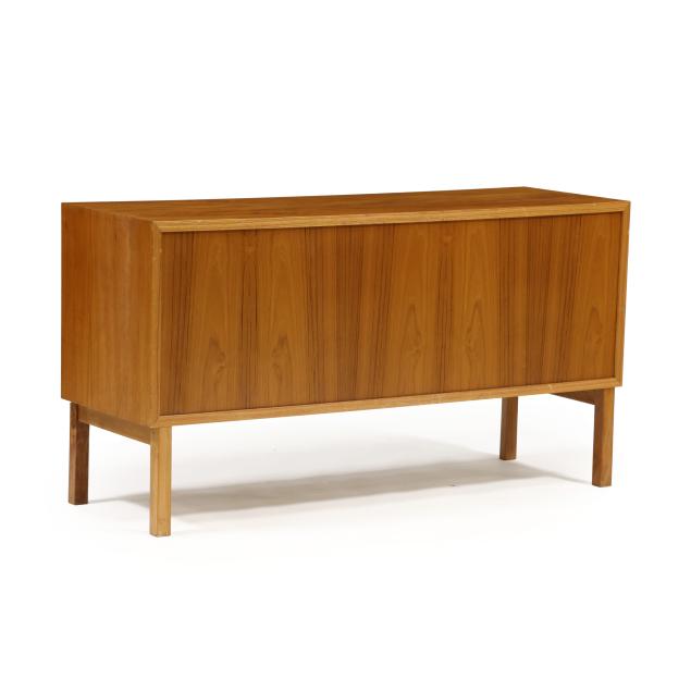 Circa 1960, teak veneer, the case with two tambour doors, divided interior with one shelf to the right side and four fitted drawers to the left, straight legs, unmarked, finished back panel.