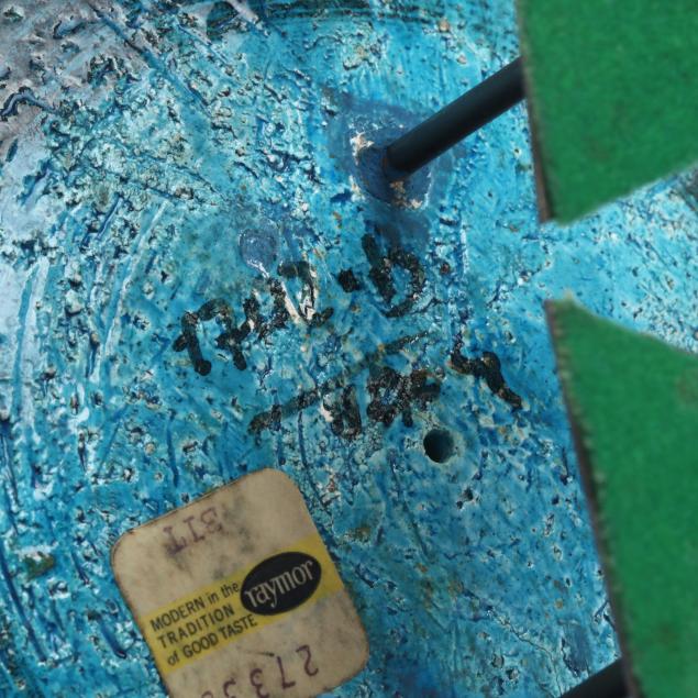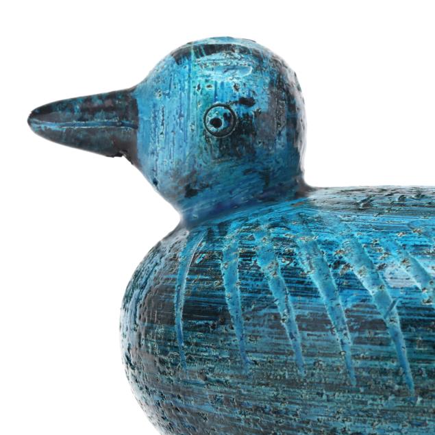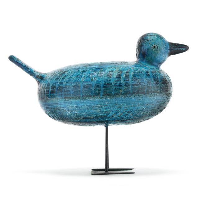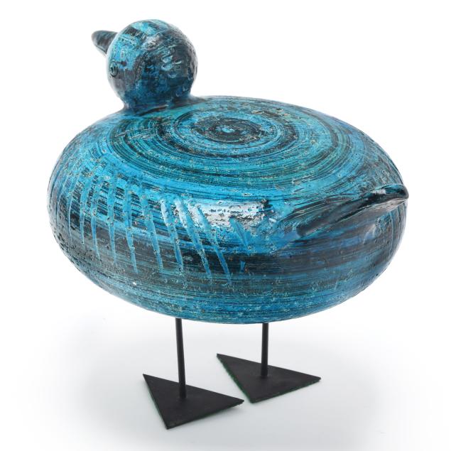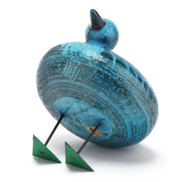 Italy, circa 1960, retailed by Raymor in the U.S., glazed ceramic bird with incised features and metal feet, marked "1702 - B / ITALY" and with period Raymor label with inventory numbers to underside.