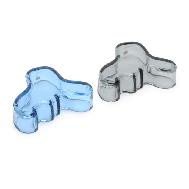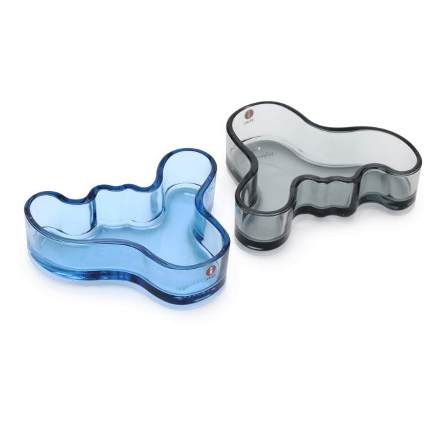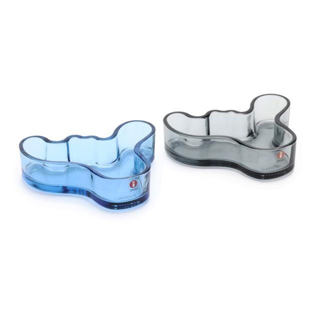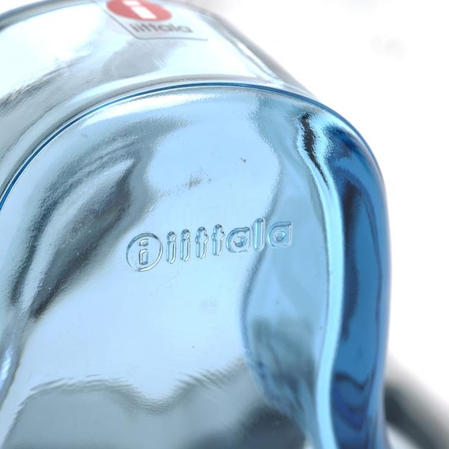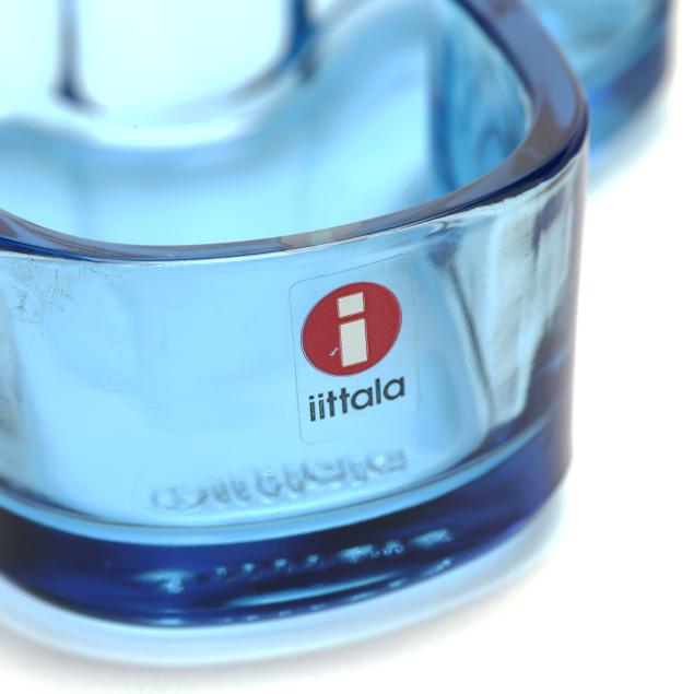 Contemporary production for Iittala, in blue and smoky glass, labeled and with raised mark.