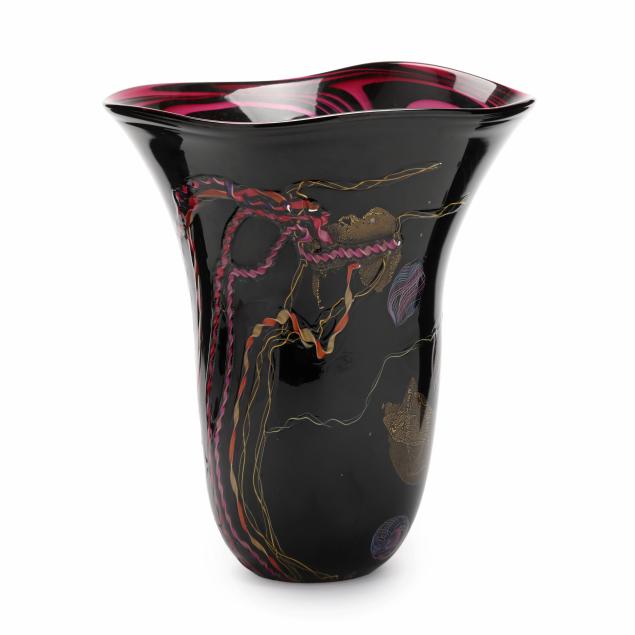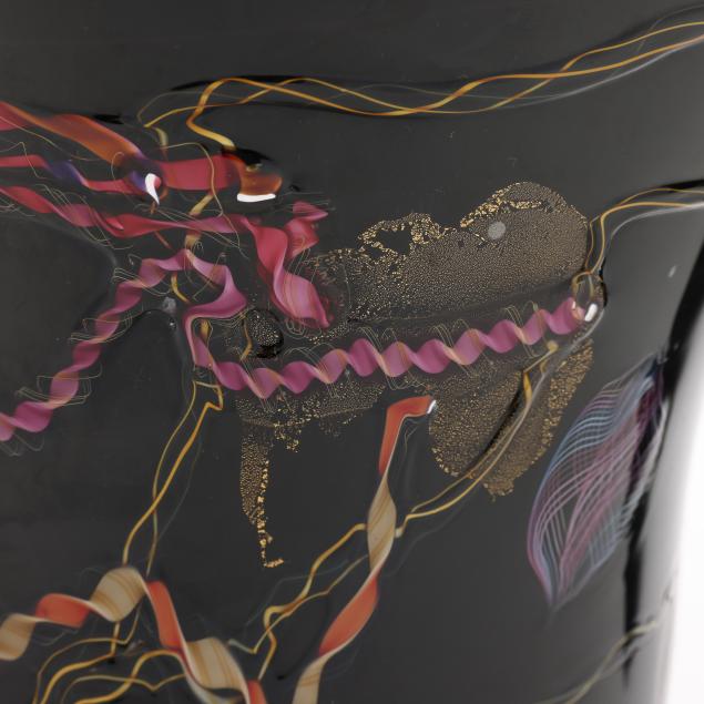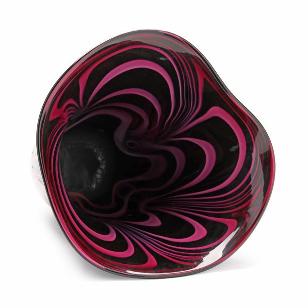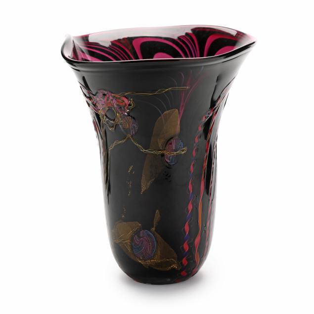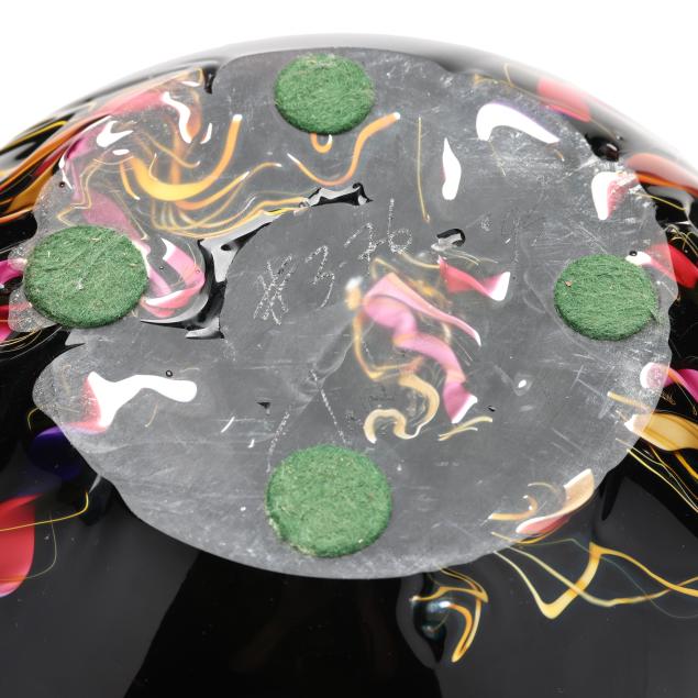 1990, thick cased blown glass, black field with abstracted cane and murrini decorations, interior with pulled purple designs, ground pontil, signed and numbered.