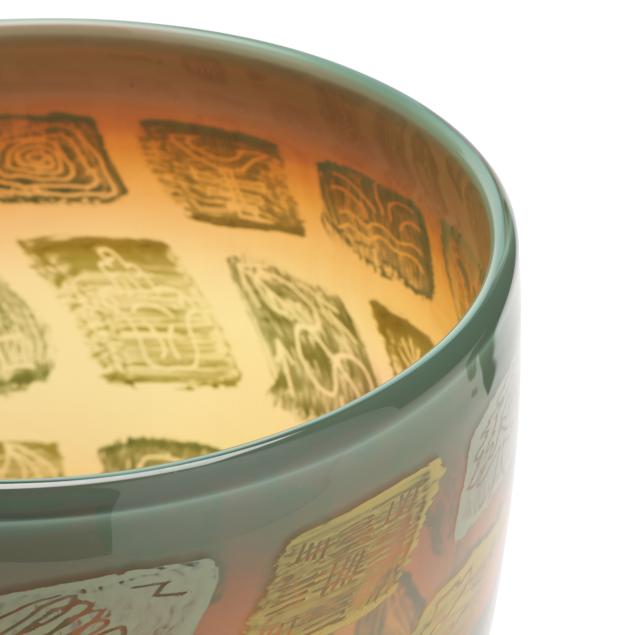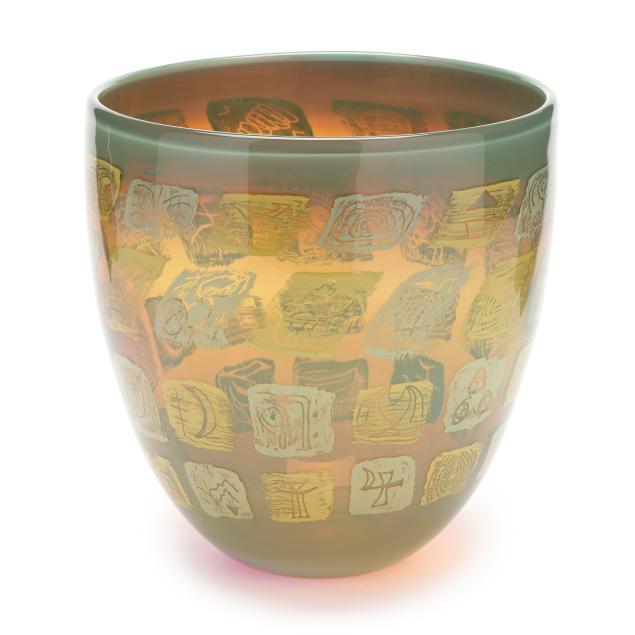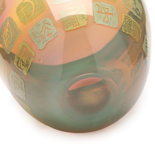 1999, collaborative blown glass, greenish opalescent glass with cased imagery panels, polished pontil, signed and illegibly titled "Amber M____ G_____ Basket #1"