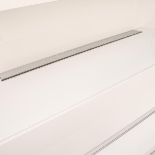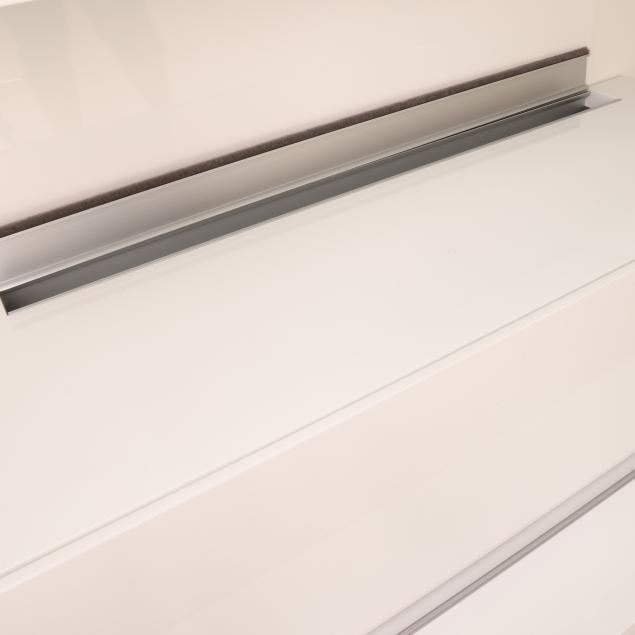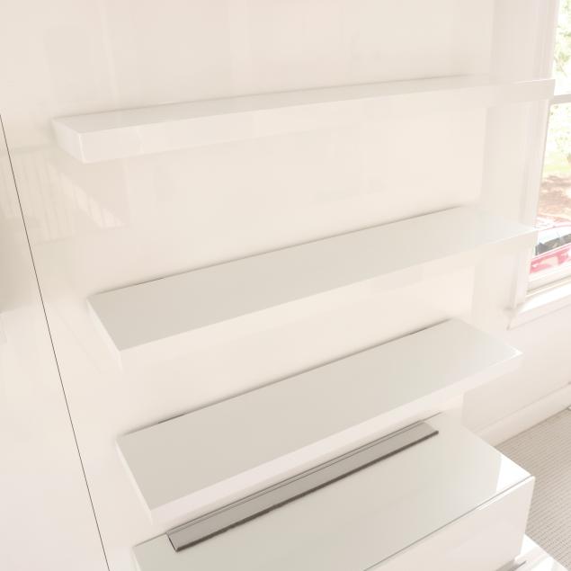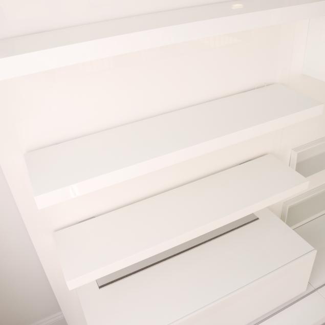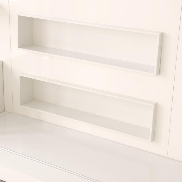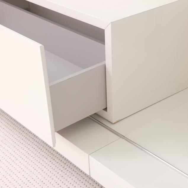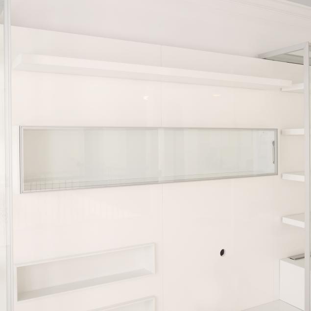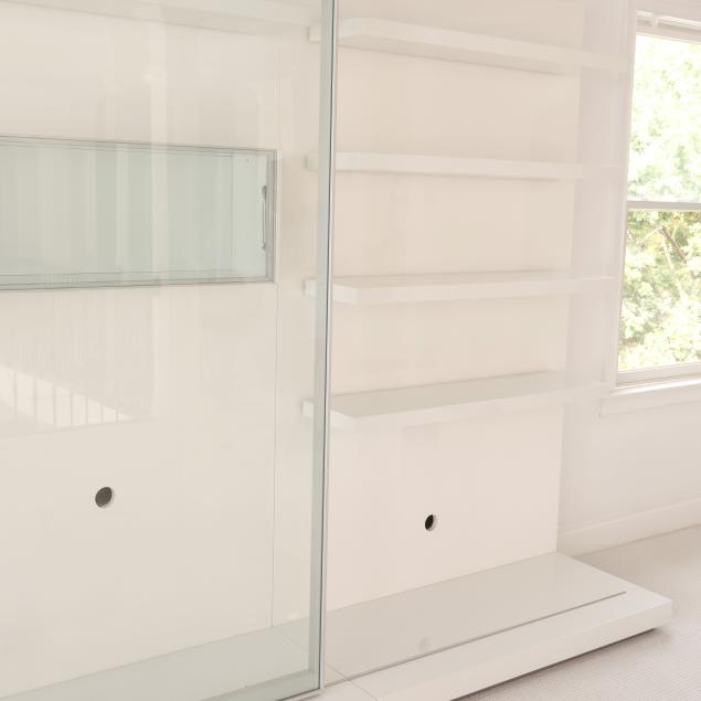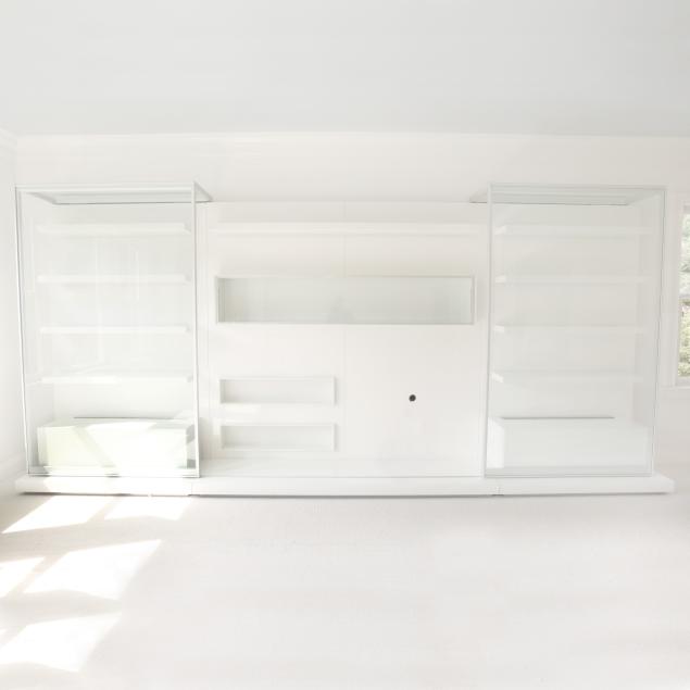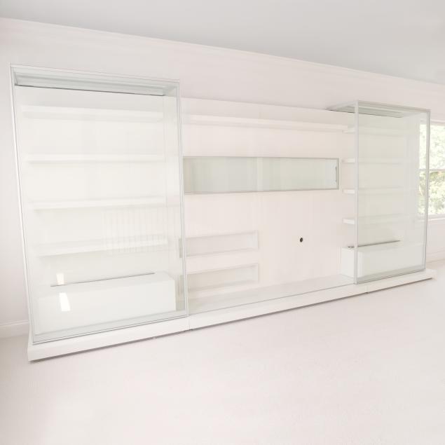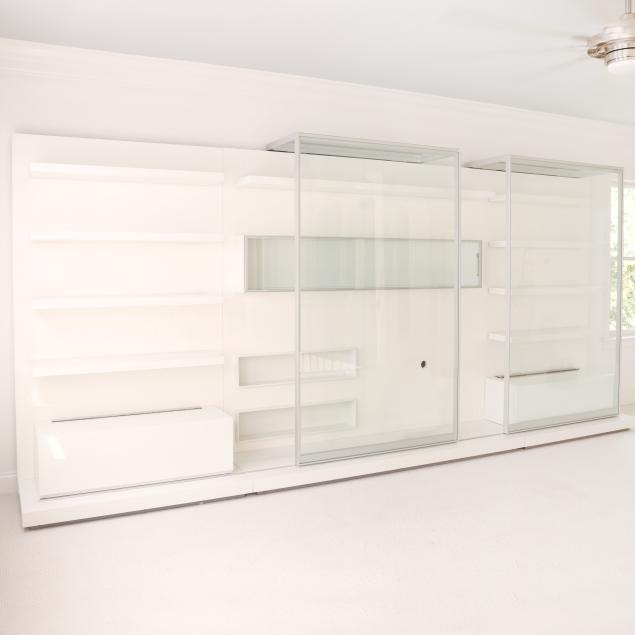 Italy, for Alivar, multi-part, wall-mount form, high gloss white lacquer, brushed steel and glass, including two tall sliding glass panels, nine lighted shelves, three recessed receptacles, two lower drawered cases, flush base, unmarked but together with order receipt.