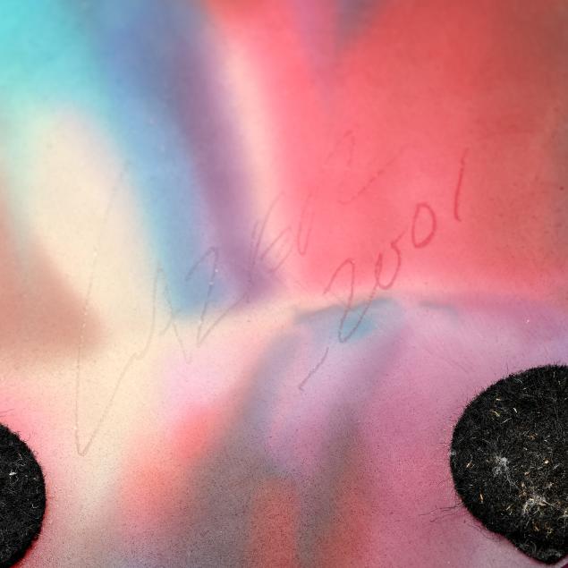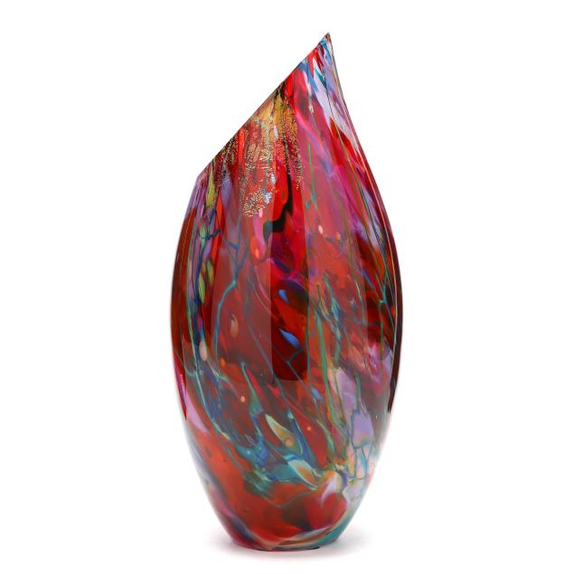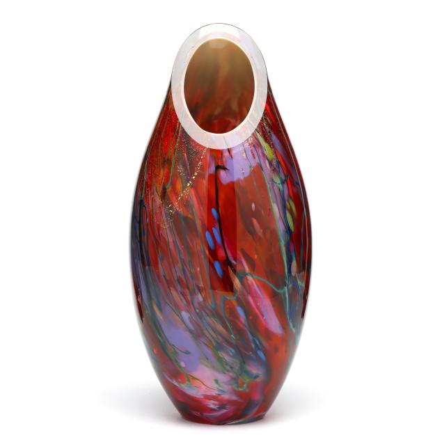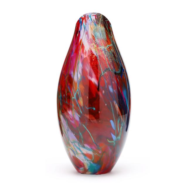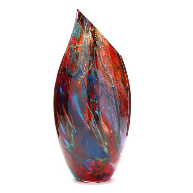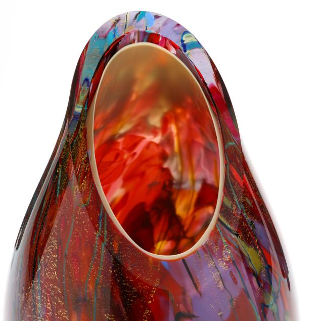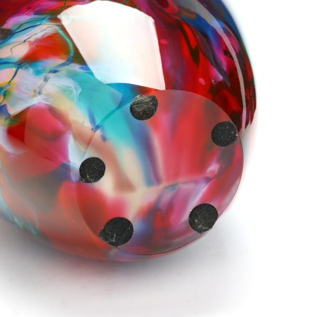 2001, thick blown cased glass with multi colored mottled and gold leaf decoration, ground base, signed.
