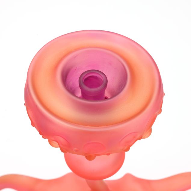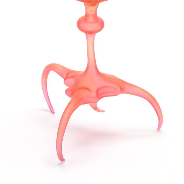 Late 20th century, thin blown satin glass in pink, orange and purple, organic shaped with removable large hollow stopper over a tri-footed bottle, appears unsigned.