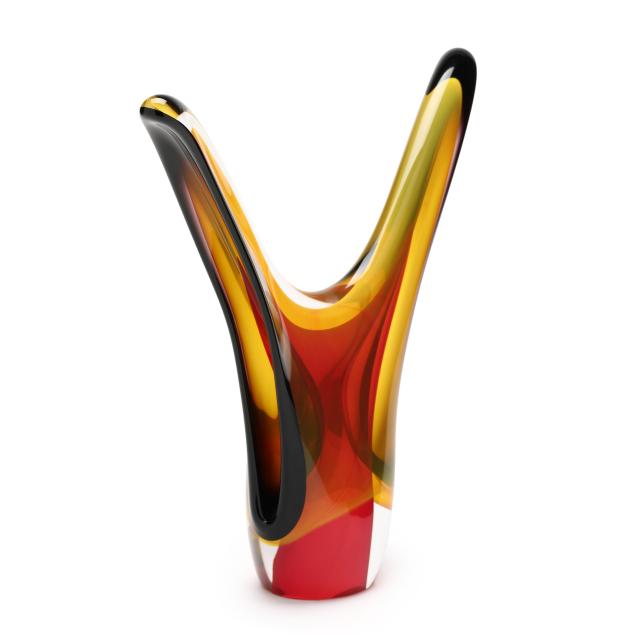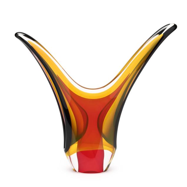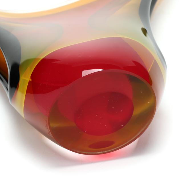 2003, thick cased blown glass in red, yellow and black lip wraps, unusual design with two openings to the sides, signed.