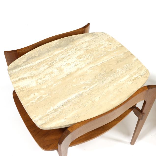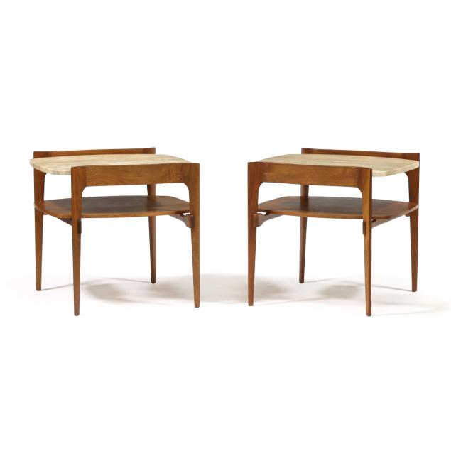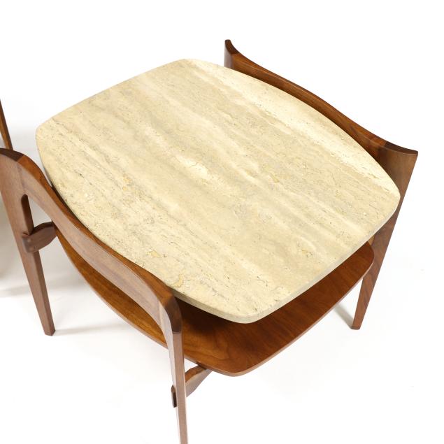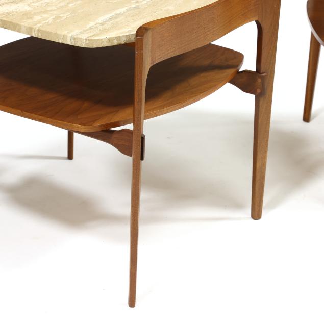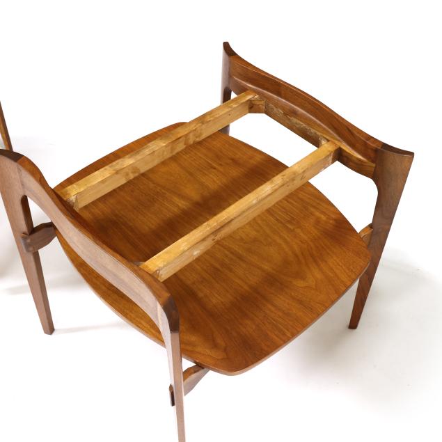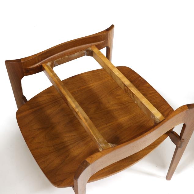 Circa 1960, labeled Gordon's of Tennessee, walnut frames with lower shelf, tapered legs.