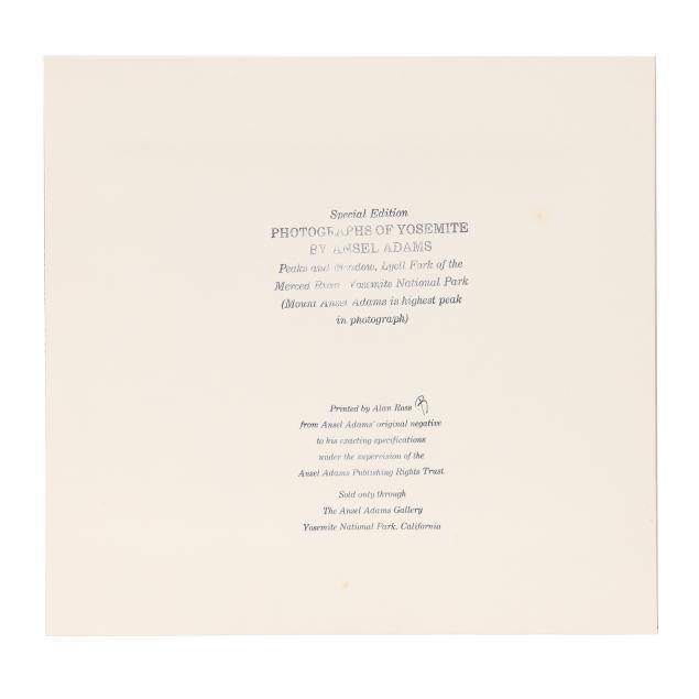 Gelatin silver print, 1943, mounted as issued, printed later by Alan Ross from Adams' original negative under his supervision, Special Edition Photographs of Yosemite stamp with the title, printer's credit (Alan Ross), and Ross' initials in ink on mount verso, framed.
