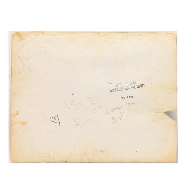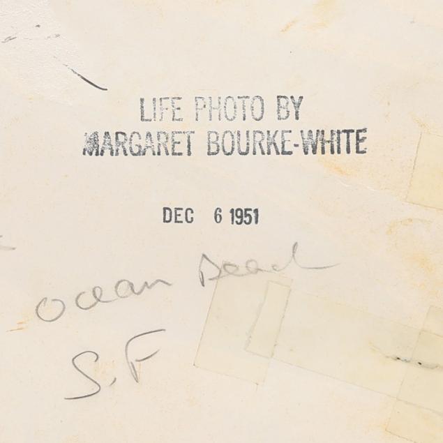 Gelatin silver print, 1951, with photographer's agency credit stamp “Life Photo by Margaret Bourke-White" and date stamp "Dec 6 1951" to verso, with additional hand-written notations, framed.