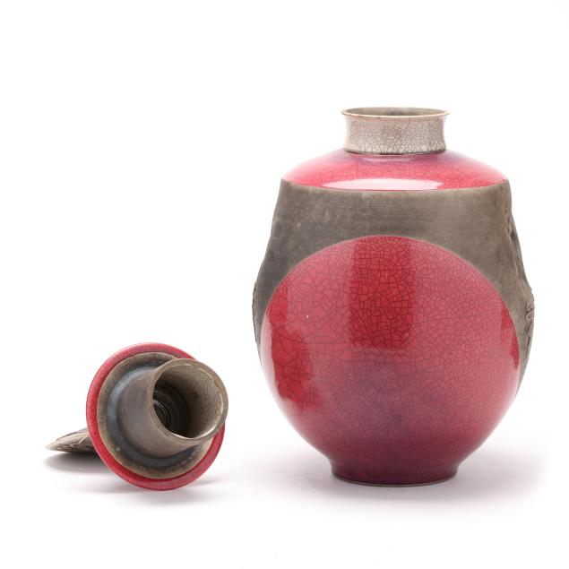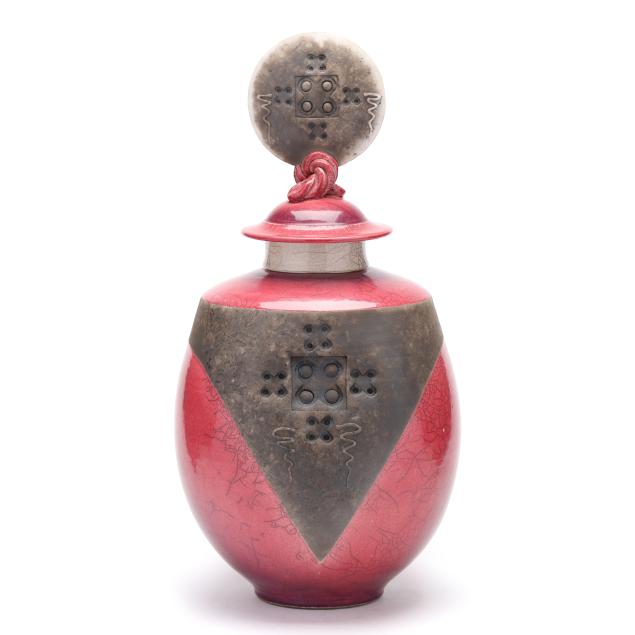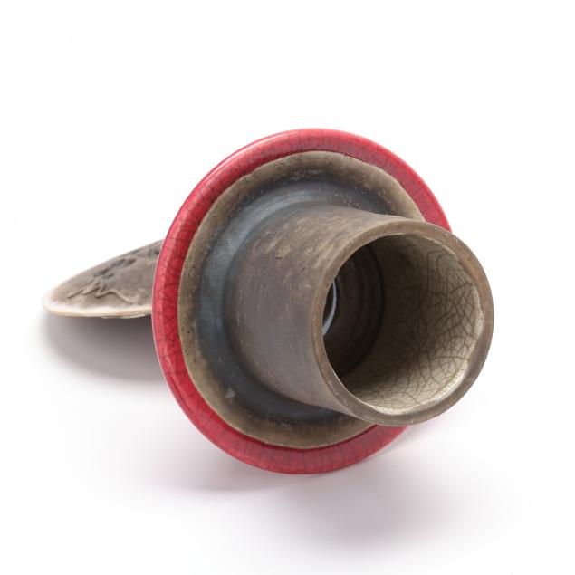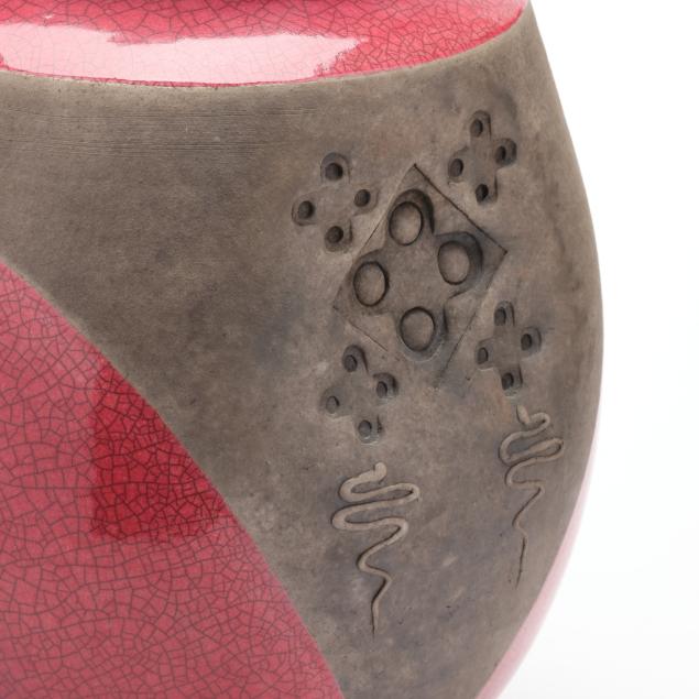 Raku fired ceramic with crimson and gray glazes, decorated in impressed geometric designs and caduceus form relief motifs, initialed "PC" to the underside.