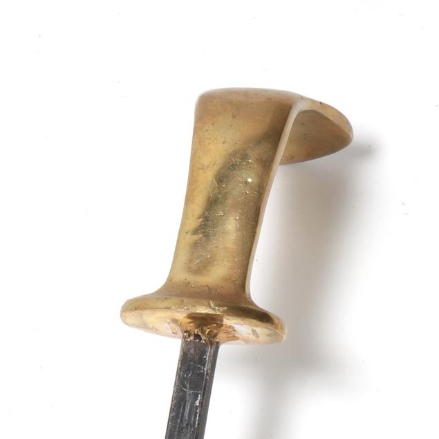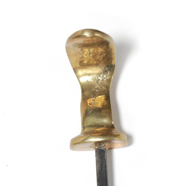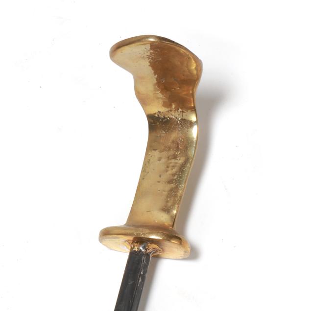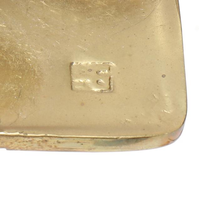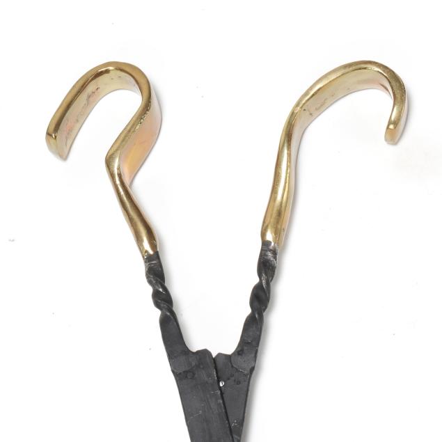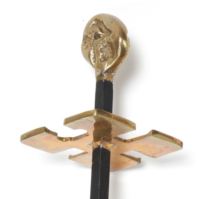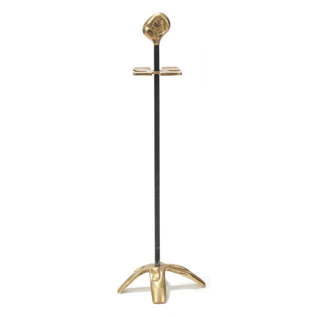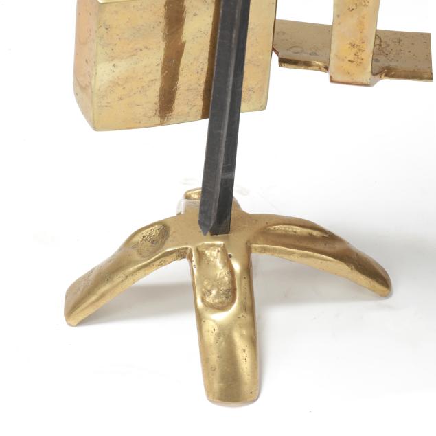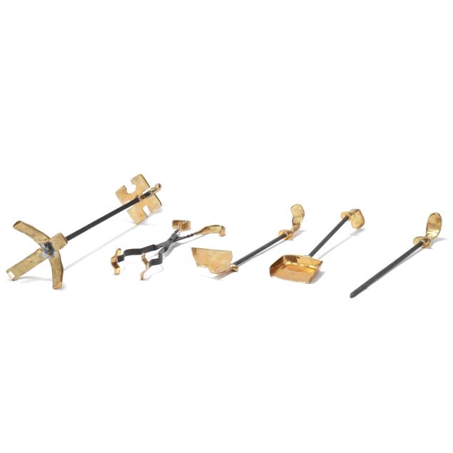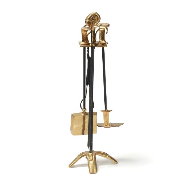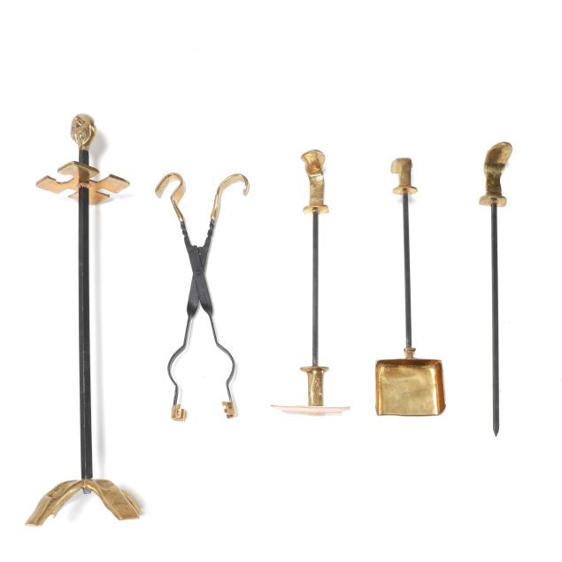 Late 20th century, cast brass and iron, to include a poker, pusher, shovel, and tongs; the stand with impressed artist monogram to the upper terrace.