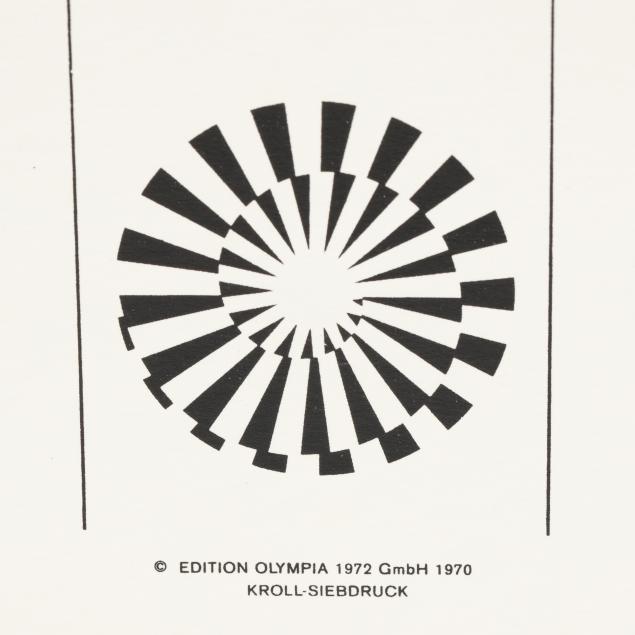 Screenprint in colors, 1970-72, pencil signed, dated, and numbered 168/200 below image, published by Edition Olympia Gmbh, Munich for the Olympische Spiele Munchen, unframed.