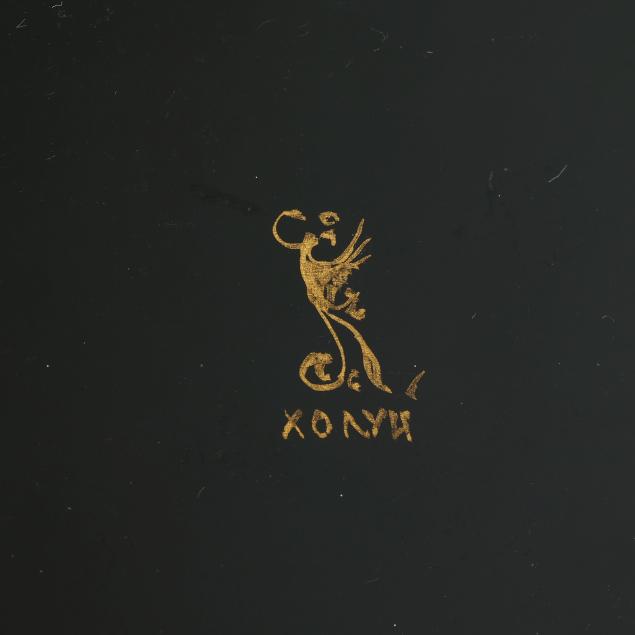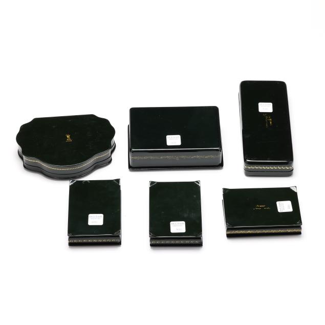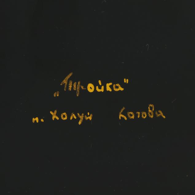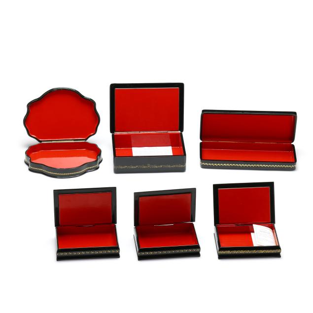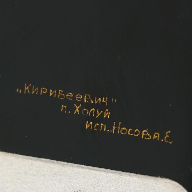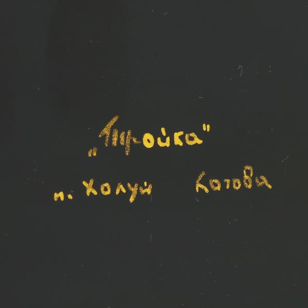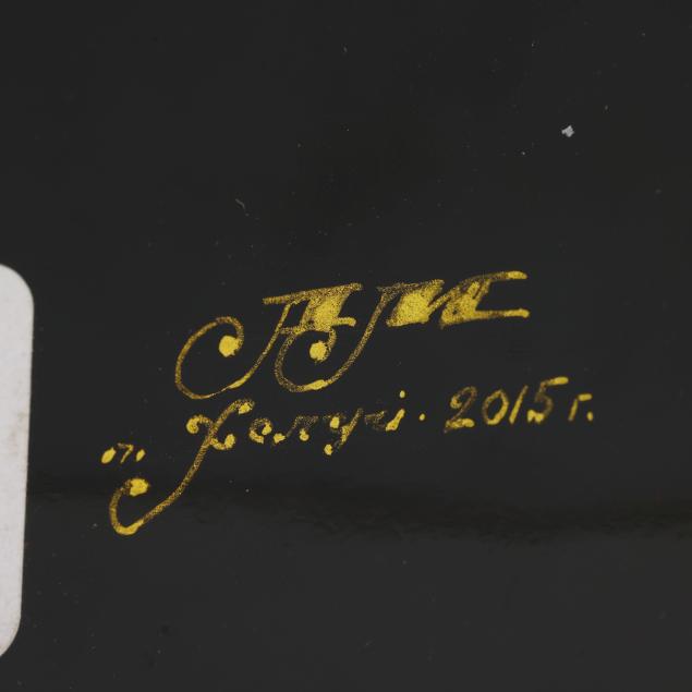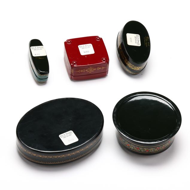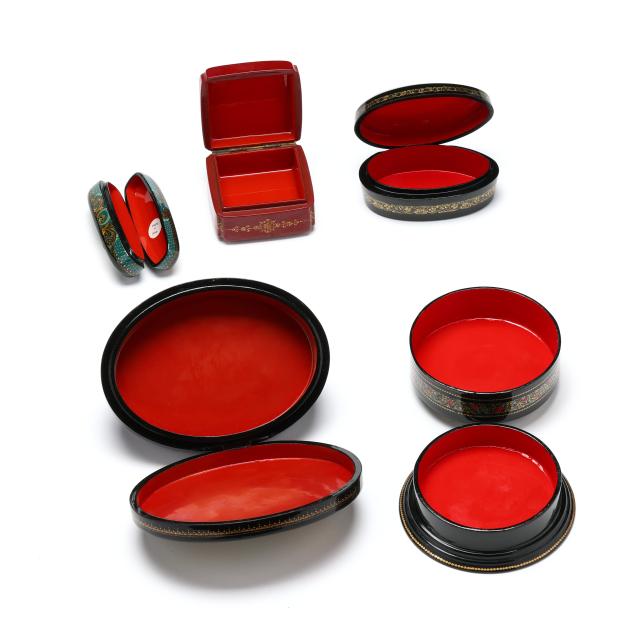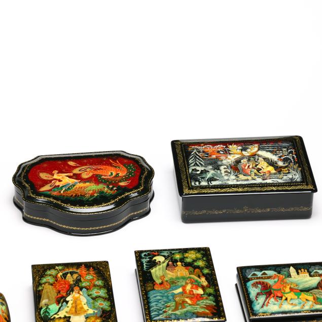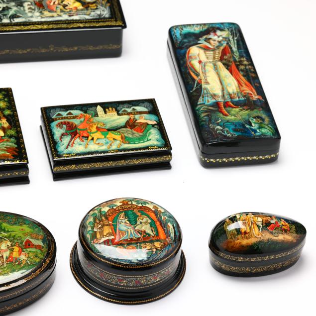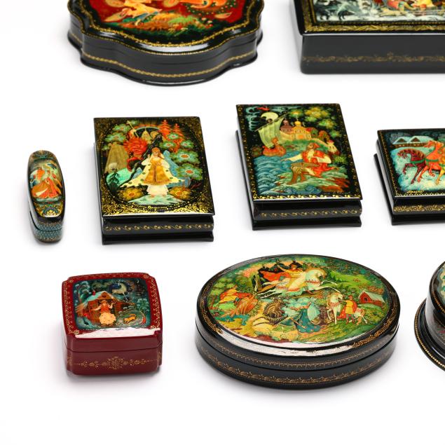 Contemporary, Russia, (11) lidded lacquer boxes with hand-painted and gilt designs depicting Russian folklore, all signed and marked with title, artist's name, and "Холуй" (Kholui) to lid or underside, most with label from John Reynolds Antiques to underside.