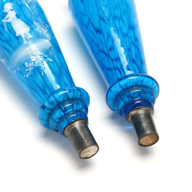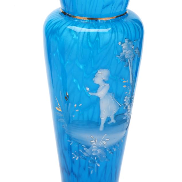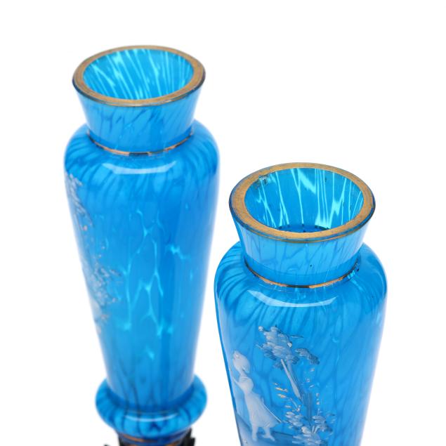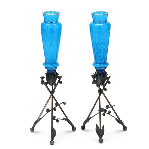 Late 19th century, manner of Mary Gregory (American, 1837-1908), unsigned, blown variegated blue glass vases with silvered banding, each featuring a hand-painted enamel child in landscape with gilt accents to the obverse, set within a tripodal silver-plated stand with floral and foliate cast elements on ball feet.