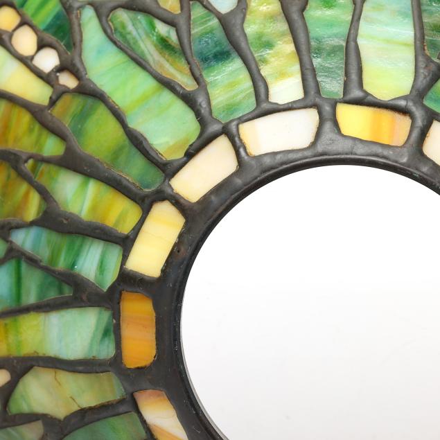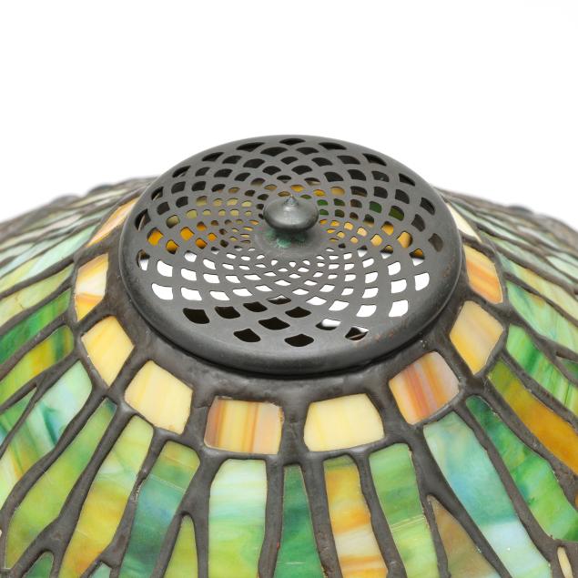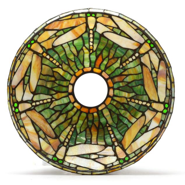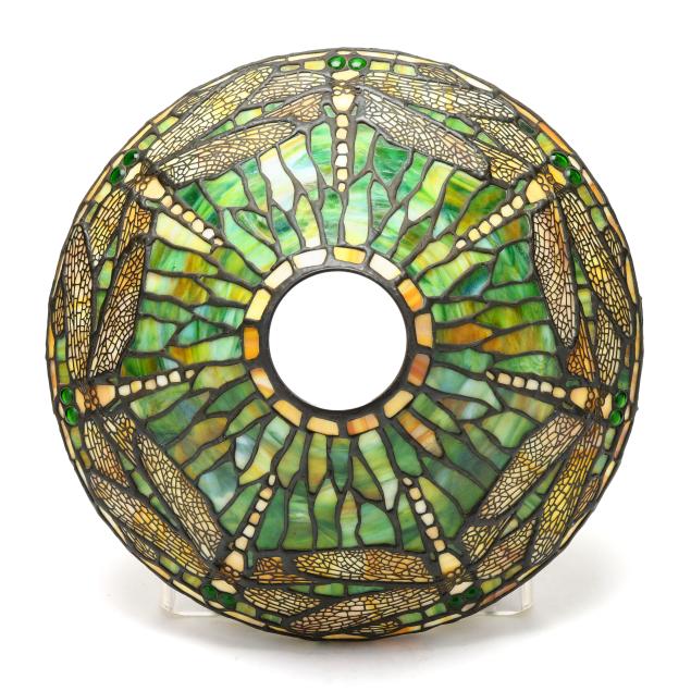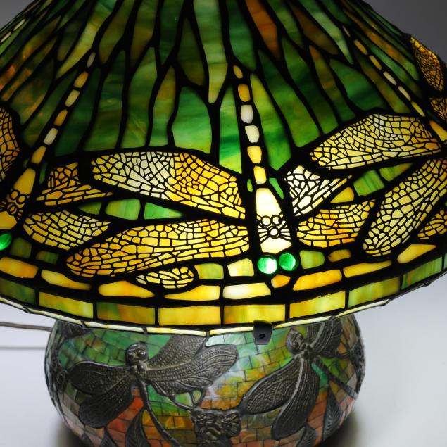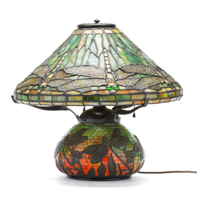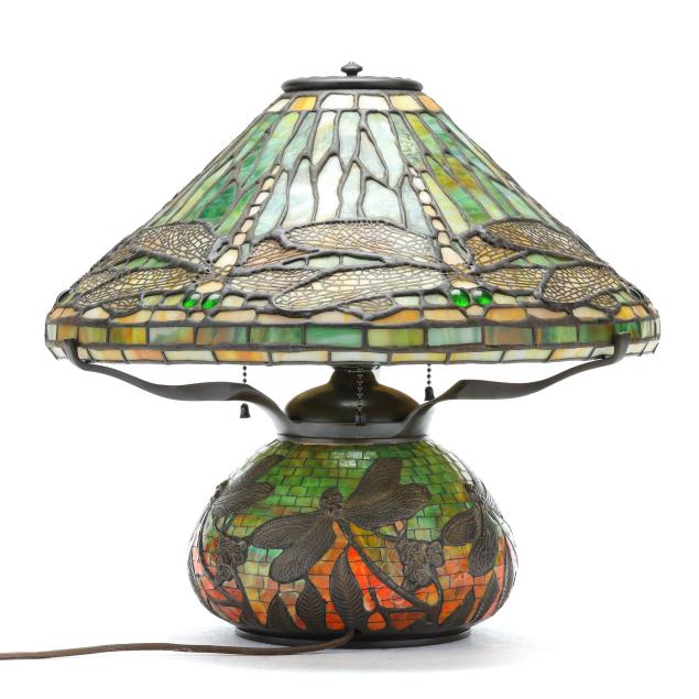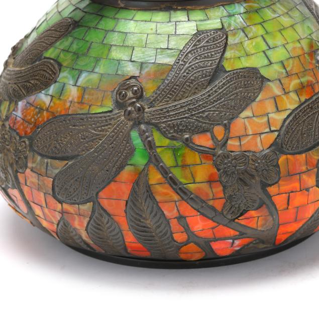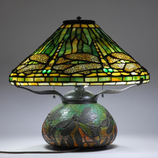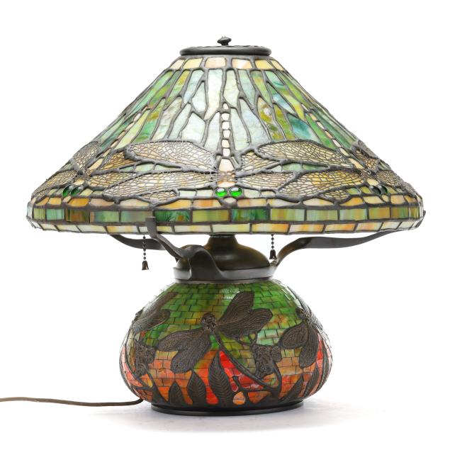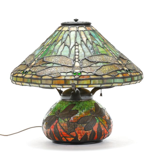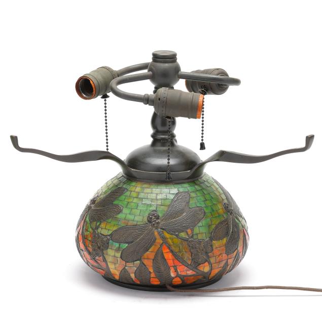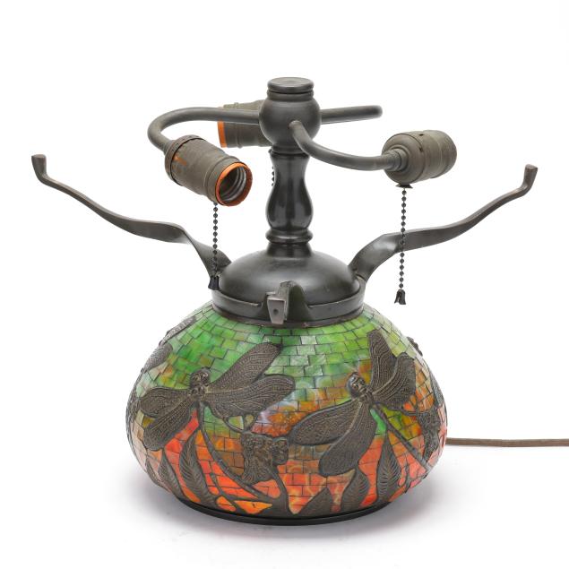 Late 20th century, unsigned, conical shade with green to cream stained glass panels and patinated came featuring six inverted dragonflies (7 1/2 x 16 3/4 x 16 3/4 in.); resting atop a bulbous base with conforming decoration on a vermillion to green mosaic field, with patinated Leviton three socket cluster fixture and reticulated heat cap. (11 1/2 in.)