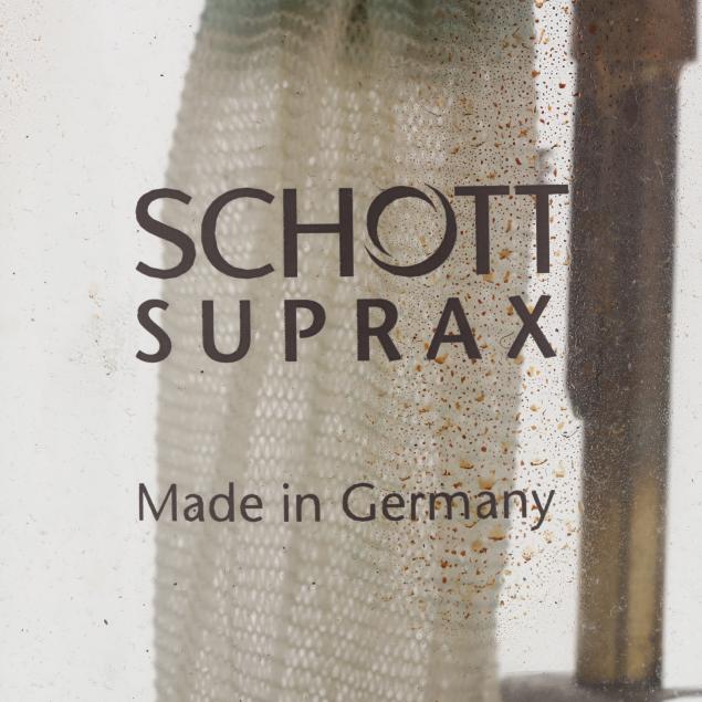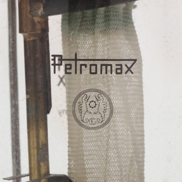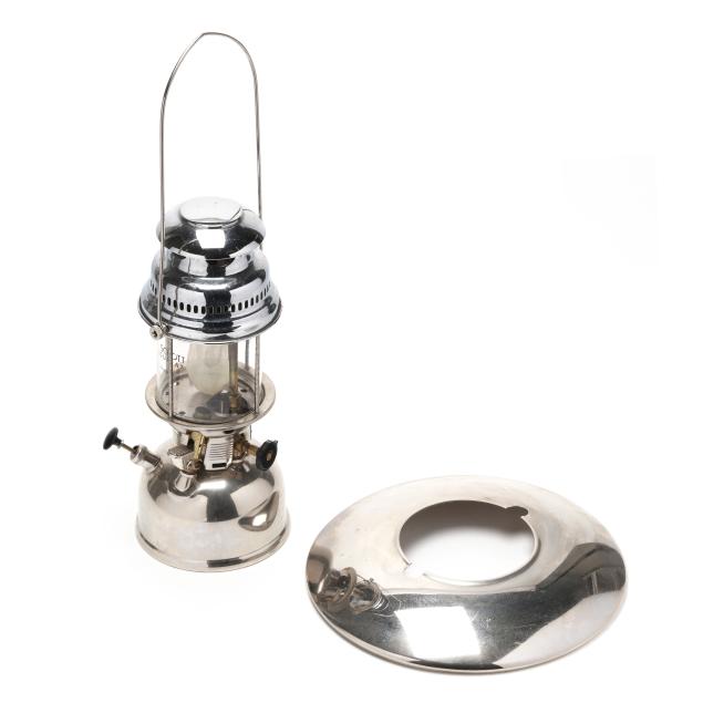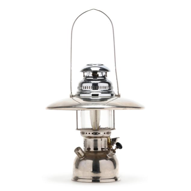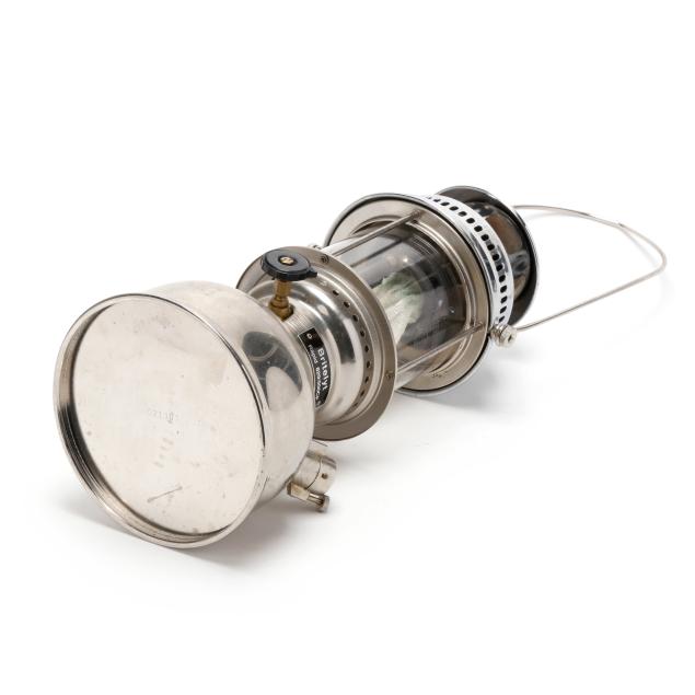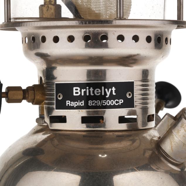 Made in Germany, nickel-plated brass lantern, labeled "Britelyt / Rapid 829 / 500CP," underside numbered 02130, with glass hurricane (chimney) signed Schott Suprax / Pteromax, beneath a disc form reflector, swing handle, and pierced cap.