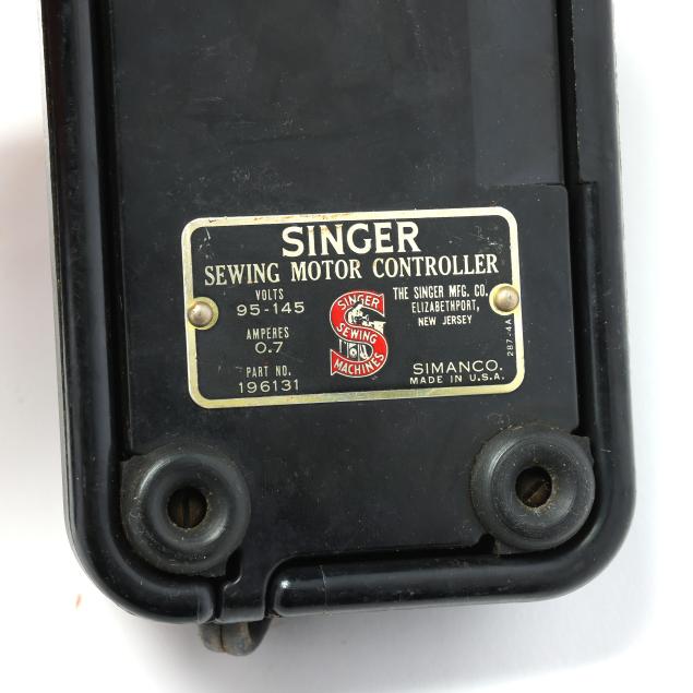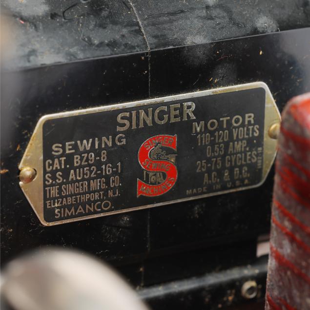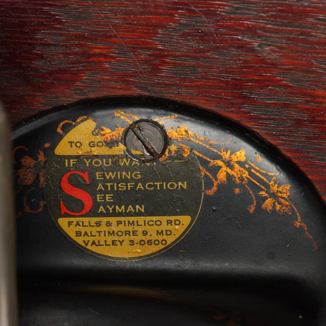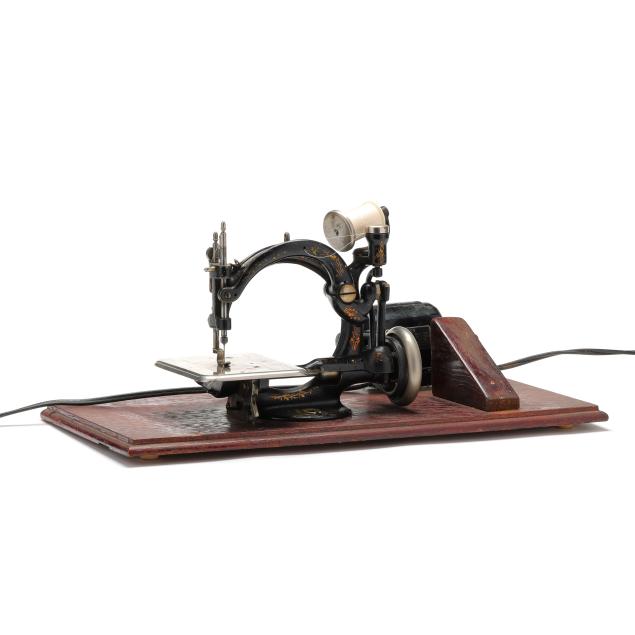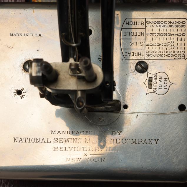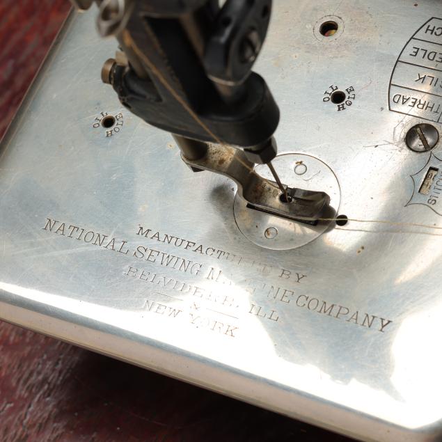 Late 19th century, the cloth plate engraved "MANUFACTURED BY NATIONAL SEWING MACHINE COMPANY/ BELVIDERE, ILL. / -&- / NEW YORK," outfitted with a Singer 110-120V motor and foot pedal, mounted atop an oak base with domed wood cover.