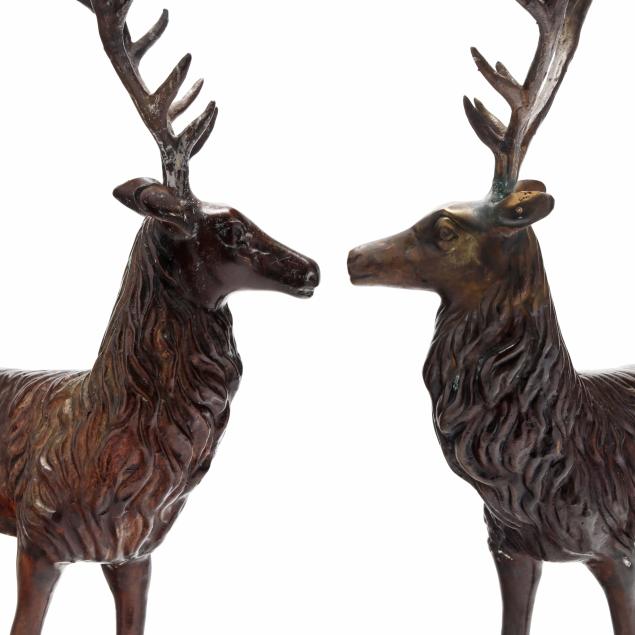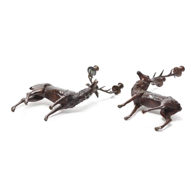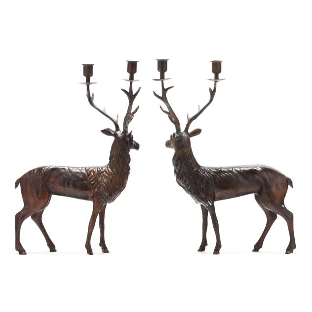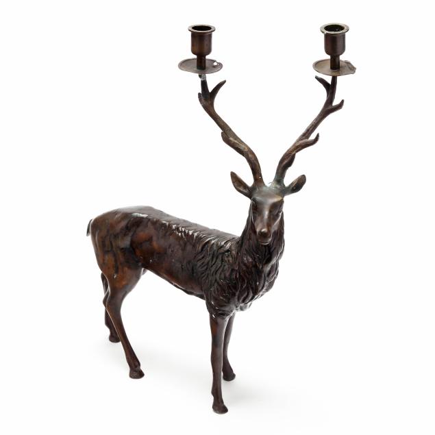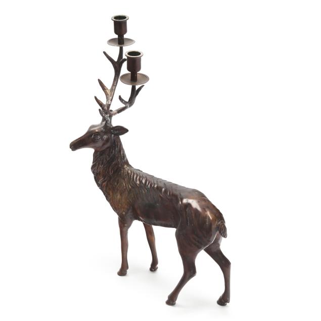 Early to mid-20th century, patinated brass standing stag two light form candelabra, unmarked. This lot includes (4) taper candles.