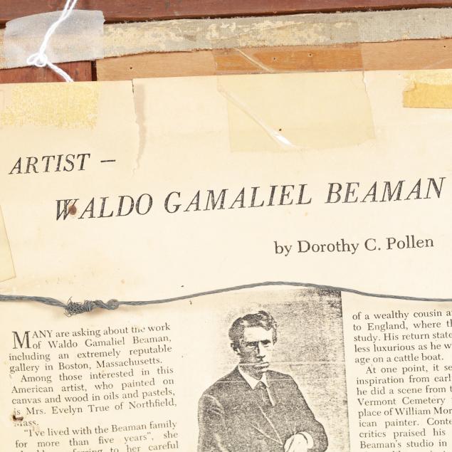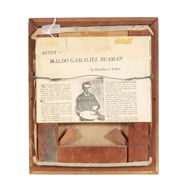 From the Estate of the late Susan C. Frankenberg, Hillsborough, North Carolina Gamaliel Waldo Beaman was a Massachusetts painter whose career began in Westminster and Northfield and included travels through the Pioneer Valley, the White Mountains, the Western Territories, and a period in Pont-Aven, France. He later worked in Boston among leading artists of the time, painted seascapes in Manchester-by-the-Sea, and produced historical views of Lookout Mountain while in Tennessee. For the last forty years of his life, he lived in Princeton, Massachusetts, focusing on local scenes such as Mt. Wachusett and Mt. Monadnock. In addition to his art, Beaman was a respected antiquarian and dealer with a lifelong interest in antiques and collectibles.