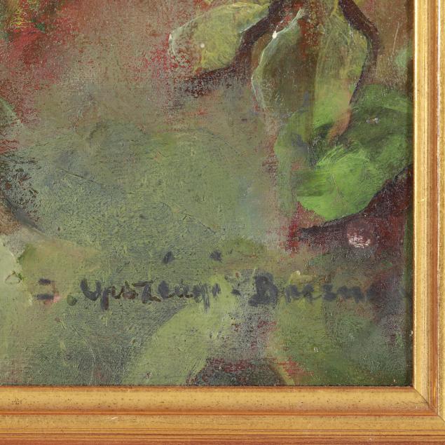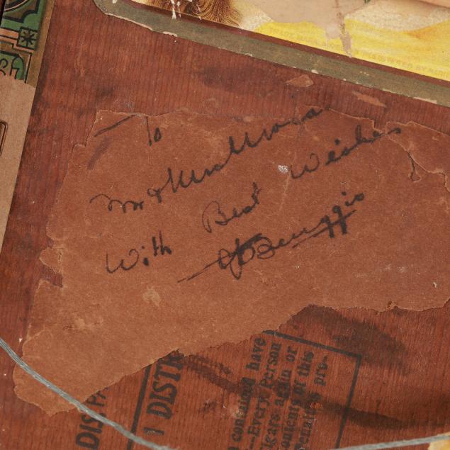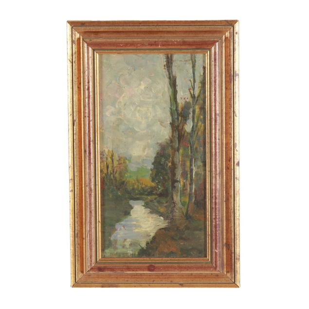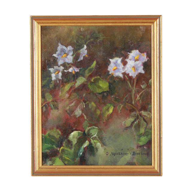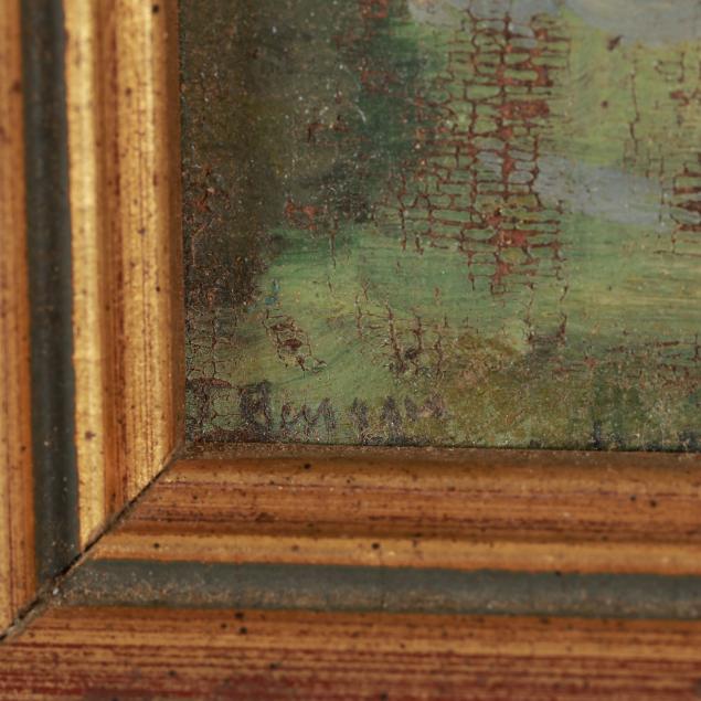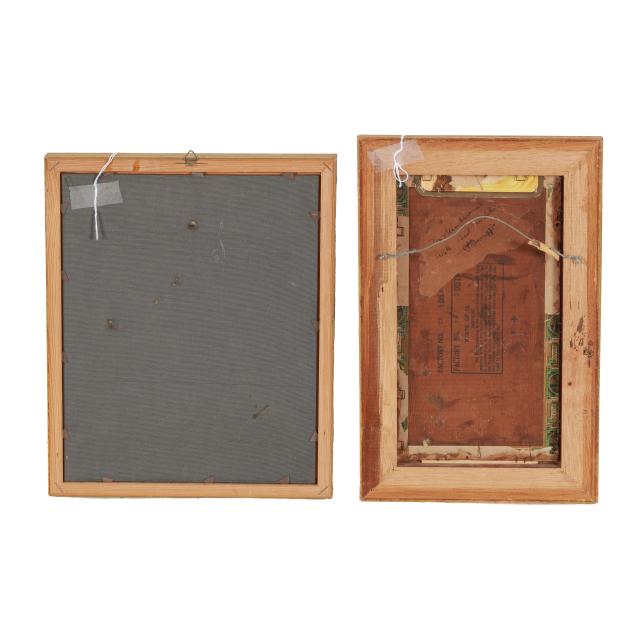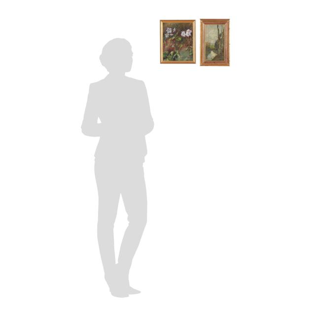 Both early 20th century; the first a landscape painting, oil on cigar box top, signed "J. Buggis" at lower left and inscribed to verso, framed (Frame dimensions 12 1/2 x 8 in.) (surface grime, spotting to frame); the second a still life painting with purple wildflowers, oil on board, unidentified signature at lower right, framed (Frame dimensions 12 3/4 x 9 1/2 in.) (light surface grime).