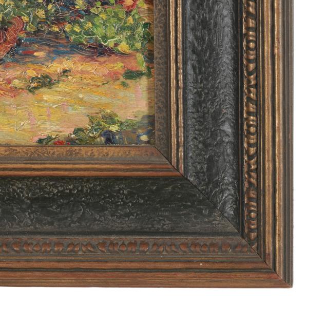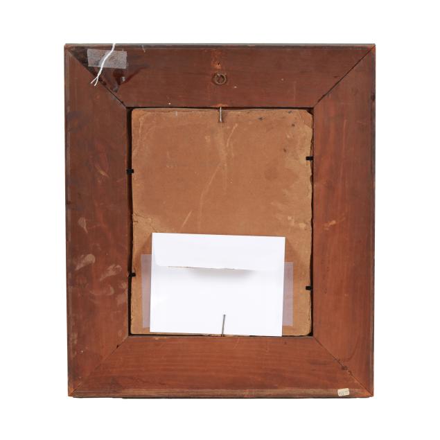 Oil on pressboard, unsigned, early 20th century, retaining a label from Clinton Lindley, Ltd. of Hillsborough, presented in a period frame.