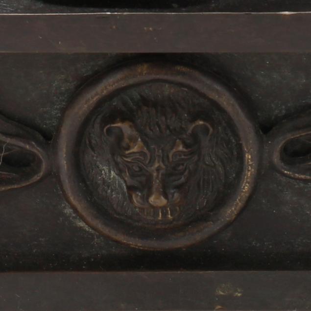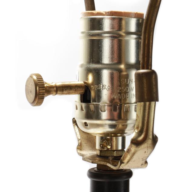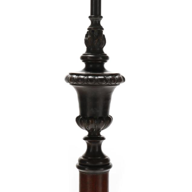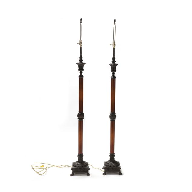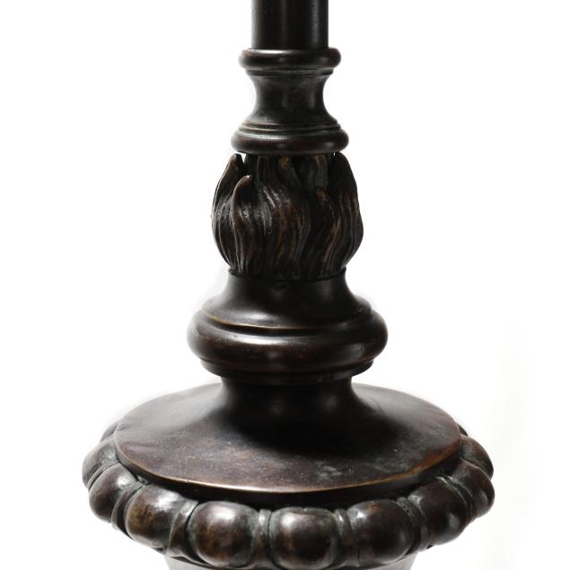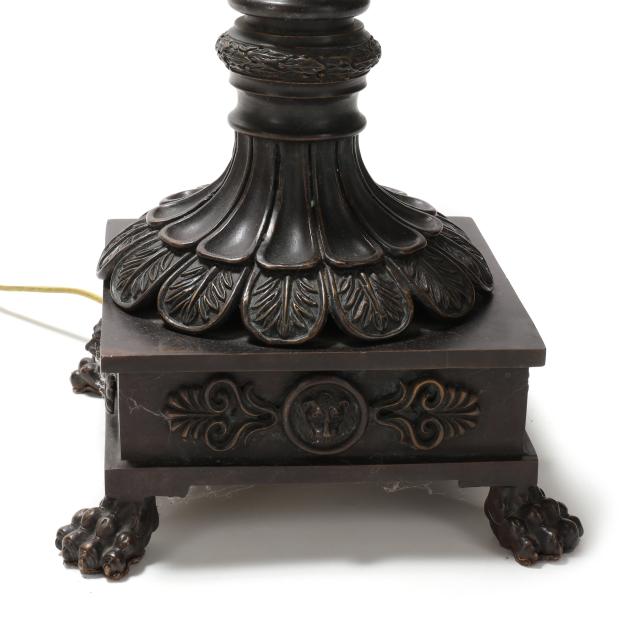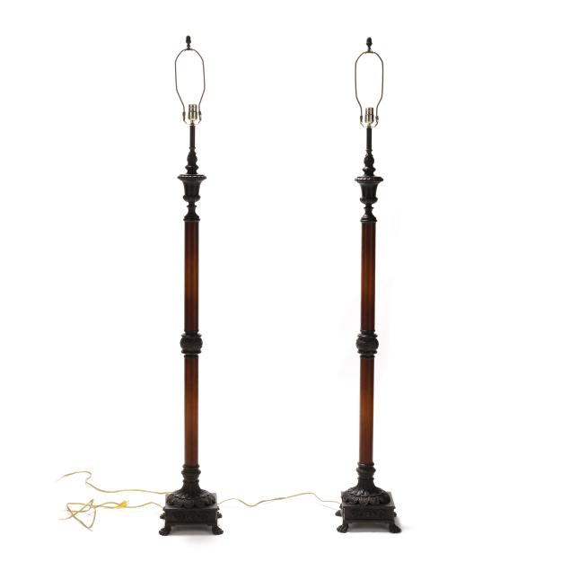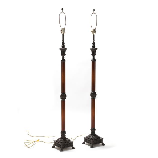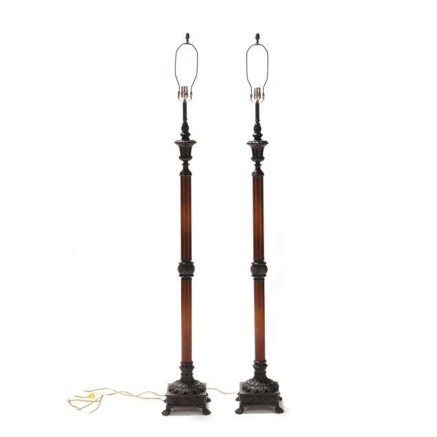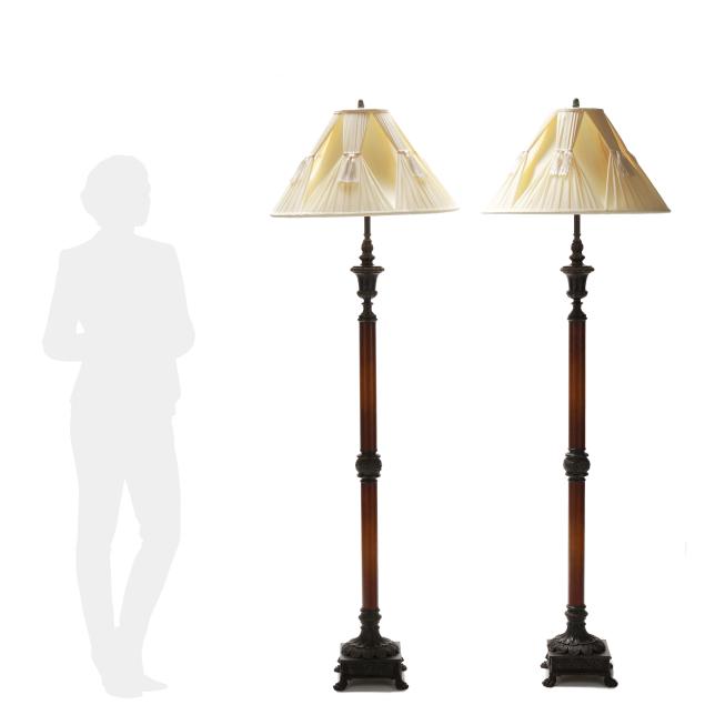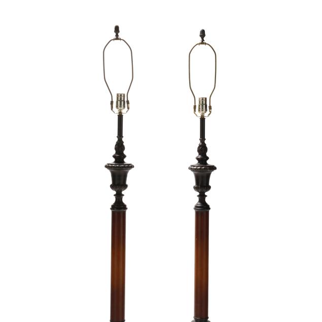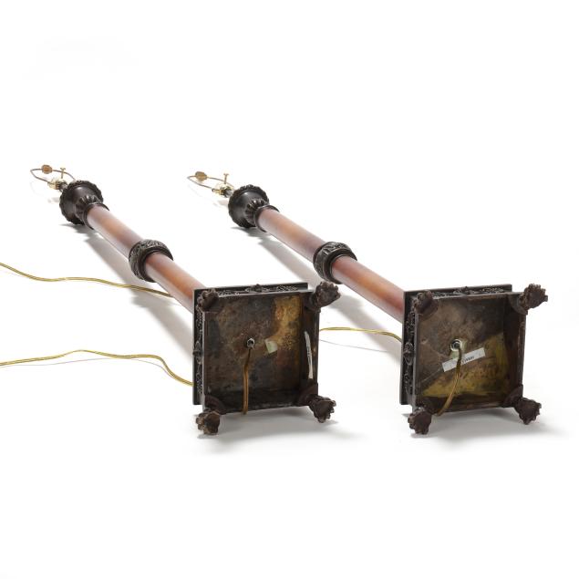 Mid- to late 20th century, patinated bronze columnar form lamps with leather wrapped stem, on four paw feet with lion's head ornament to base, artichoke finials, and silk lined shades with tassels, one with label to underside, the other with partial label.
