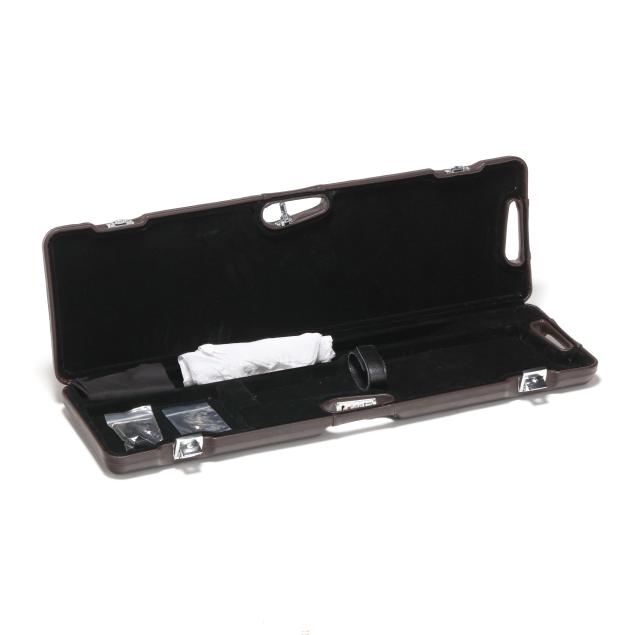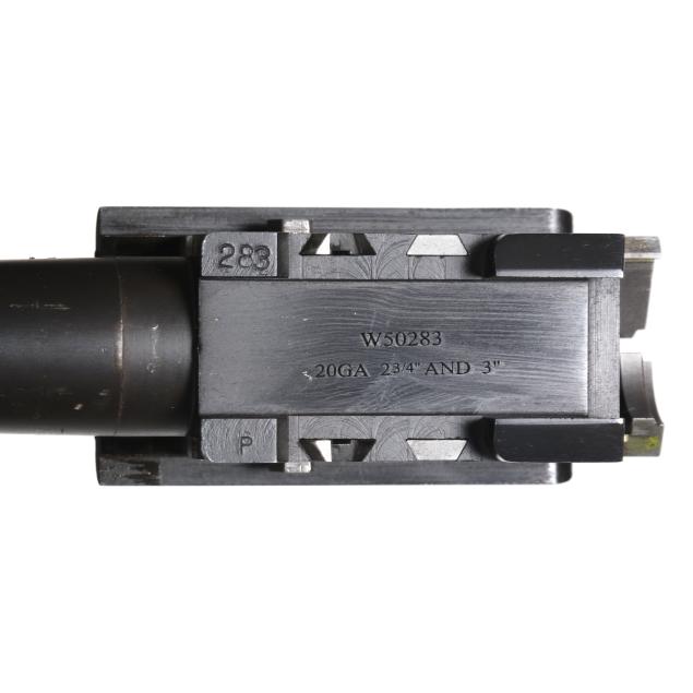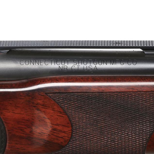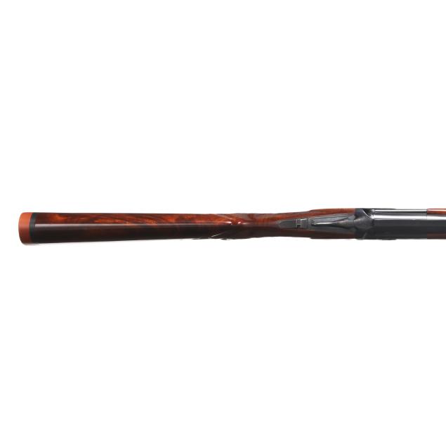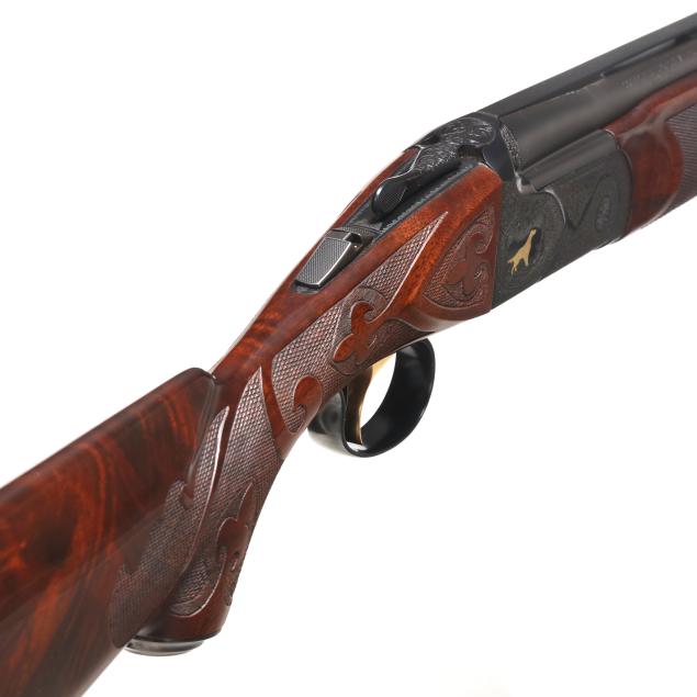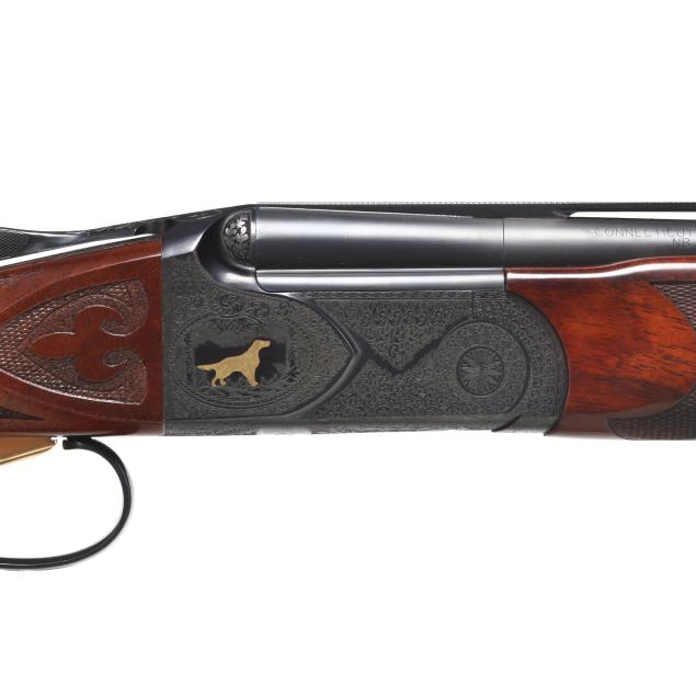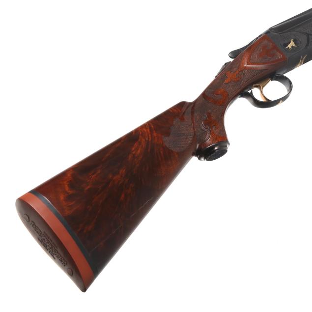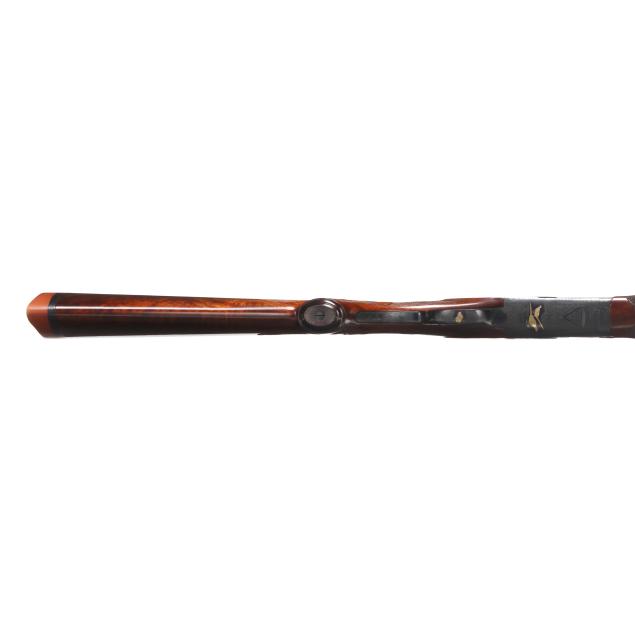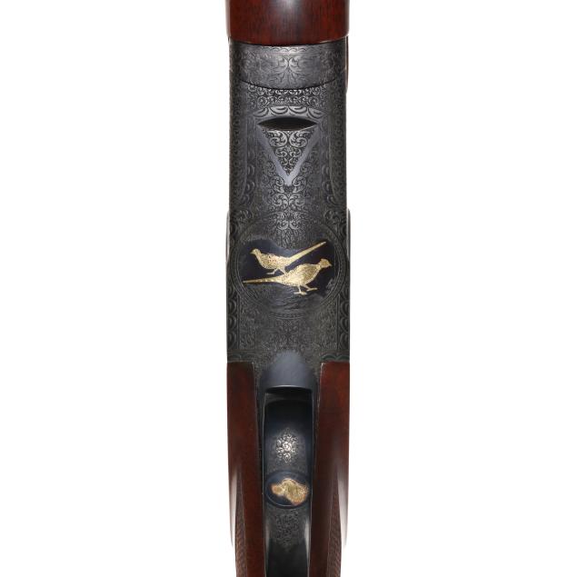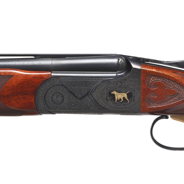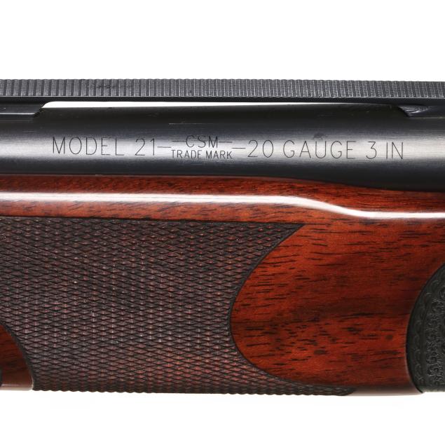 Serial number W50283 present on O/U receiver top lever, test of MODEL 21 CSM TRADE MARK 20GA 3" present on 28 in. blued steel barrel with matted vent rib and fiber optic front sight and screw-in choke tubes, complete engraved coverage of blued receiver with gold inlay dogs and pheasants, dog head gold inlay on trigger guard, single selective gold washed trigger, automatic safety, ejectors, highly figured and ornately checkered walnut stock and forend, blued steel capped pistol grip with inscription of GRAND AMERICAN engraved around cap curcumference, WINCHESTER replica recoil pad.