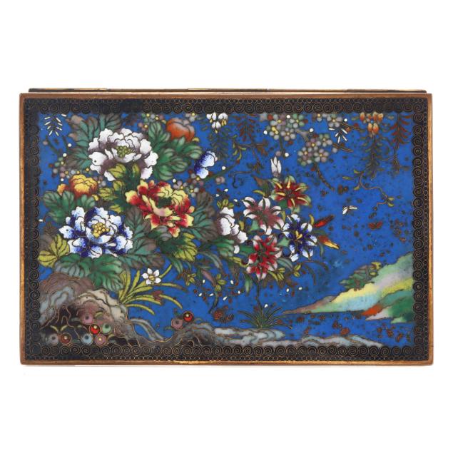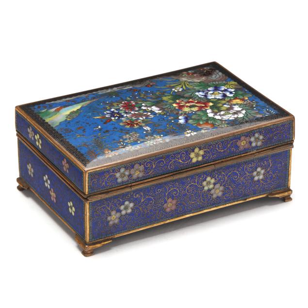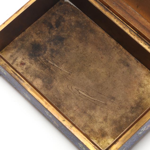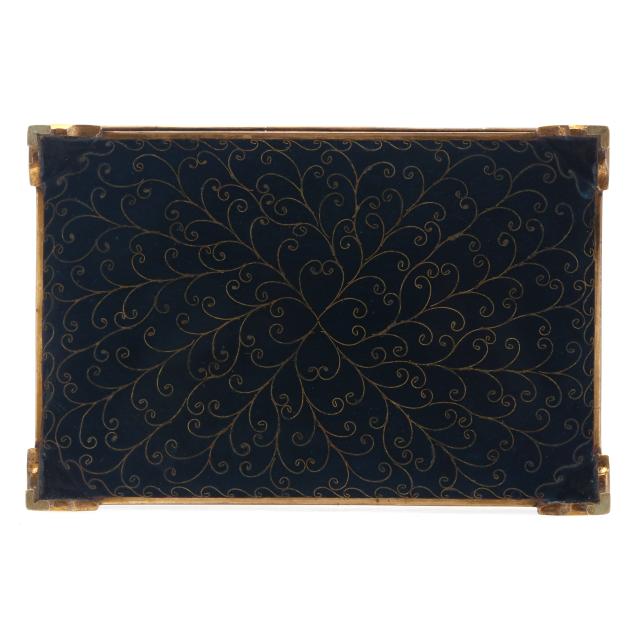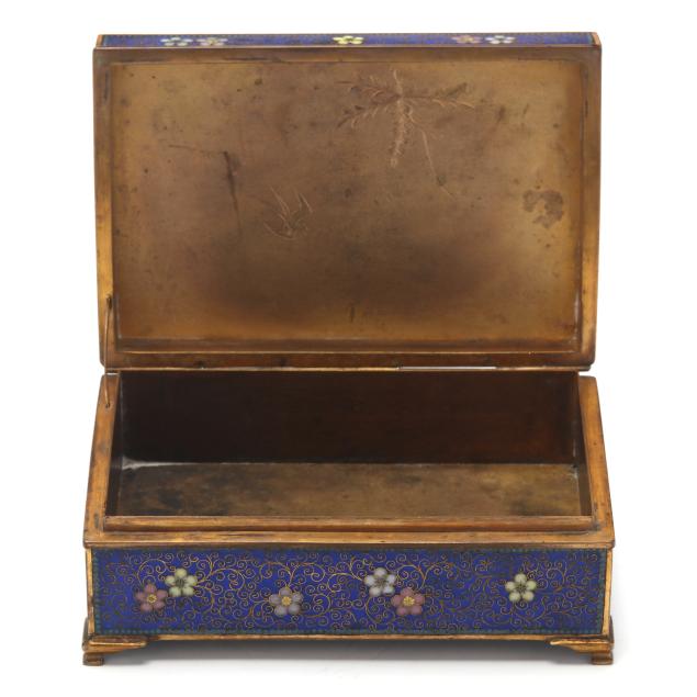 Meiji or Taisho period, early 20th century, Nagoya school, blue ground with scroll decoration in gold amidst plum blossoms, large bright colored flowers to cover, underside with gold scrolls on black ground, brass mounts, interior lined in brass incised with decoration of a bird and fish, raised on four feet, appears unmarked.