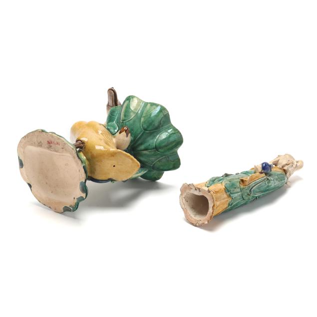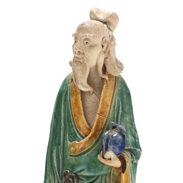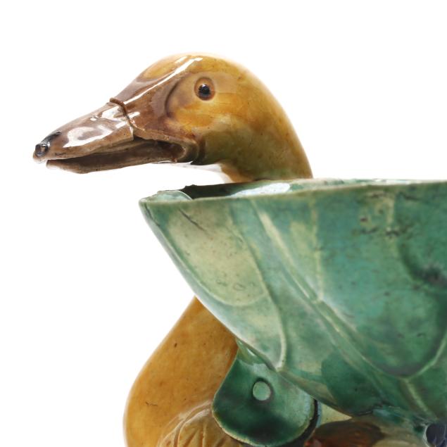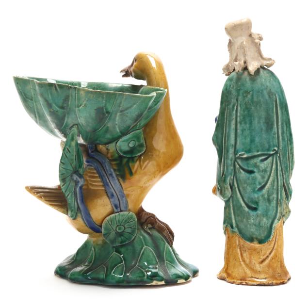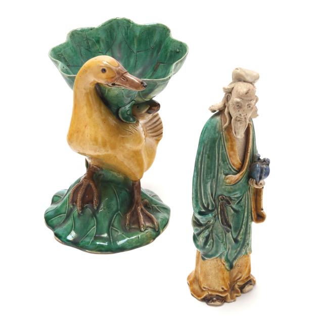 20th century, includes a sage standing in loose robes and holding a large peach, writing BIX to interior of underside (9 1/2 in.)(some cracks to chest area possibly caused during firing; a break with loss to hair in back of head), and a duck with water lily pad shaped bowl resting on its back, marked to underside Hong Kong, and impressed with number 292 (8 1/4 x 5 x 7 in.)(break with repair to duck's bill; some fritting to rim of lily pad bowl).