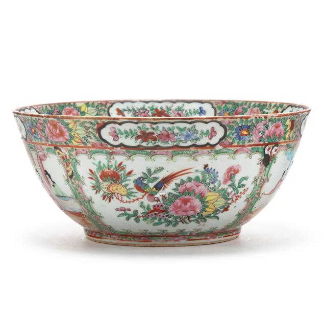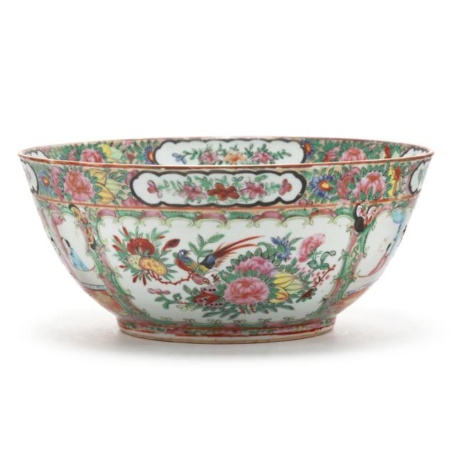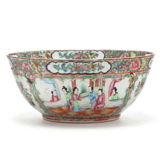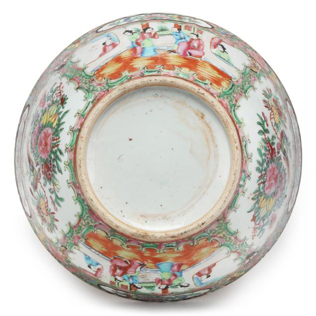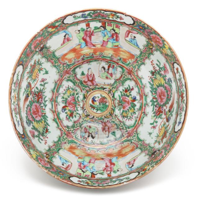 Early 20th century, interior sides of the bowl are divided into shaped registers with decoration of birds and flowers alternating with scenes of ladies and gentlemen in outdoor courtyards, the very center of the bowl has a small medallion with a rose and bird, exterior sides decorated in the same manner.