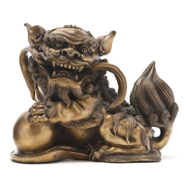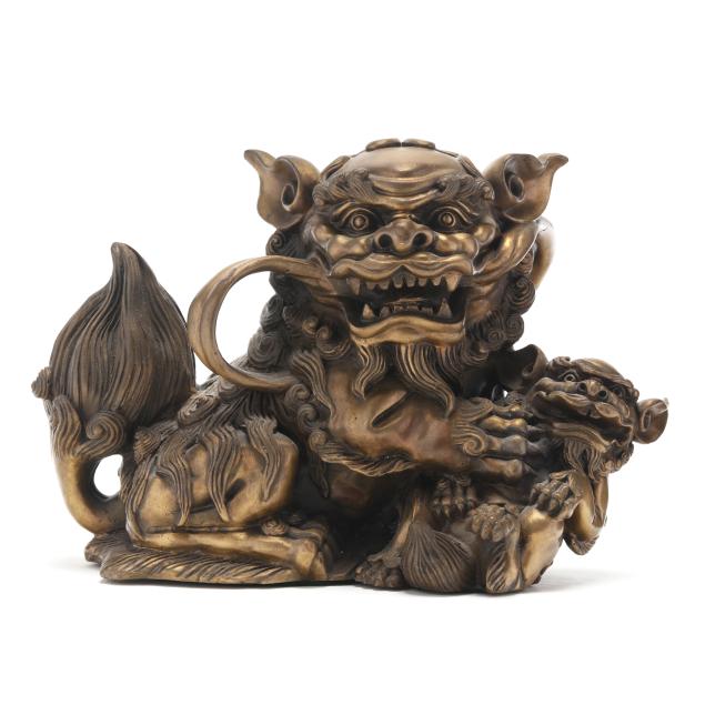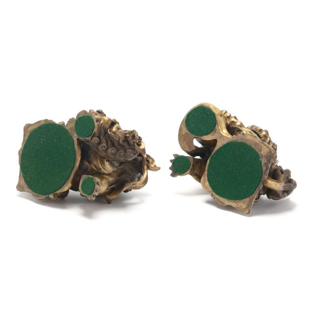 From the Collection of Madeleine Katavolos, Pinehurst, North Carolina Good estate condition; some scattered surface rubbing and wear; green felt to underside of both lions; some loose casting fragments to the interior.