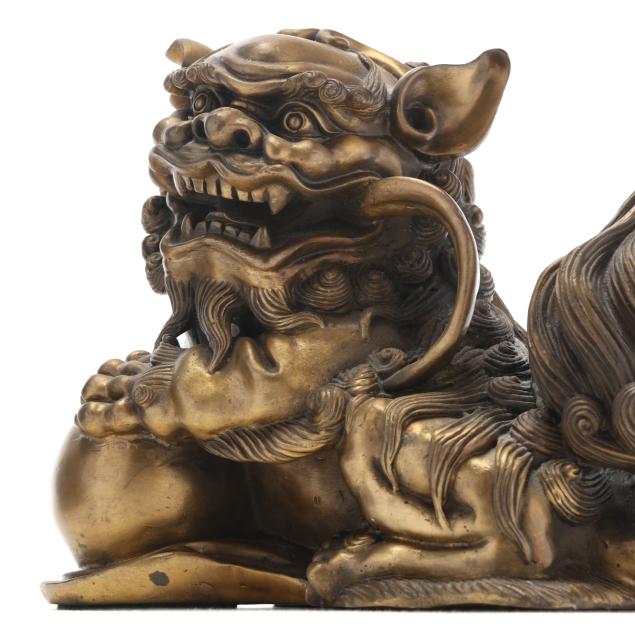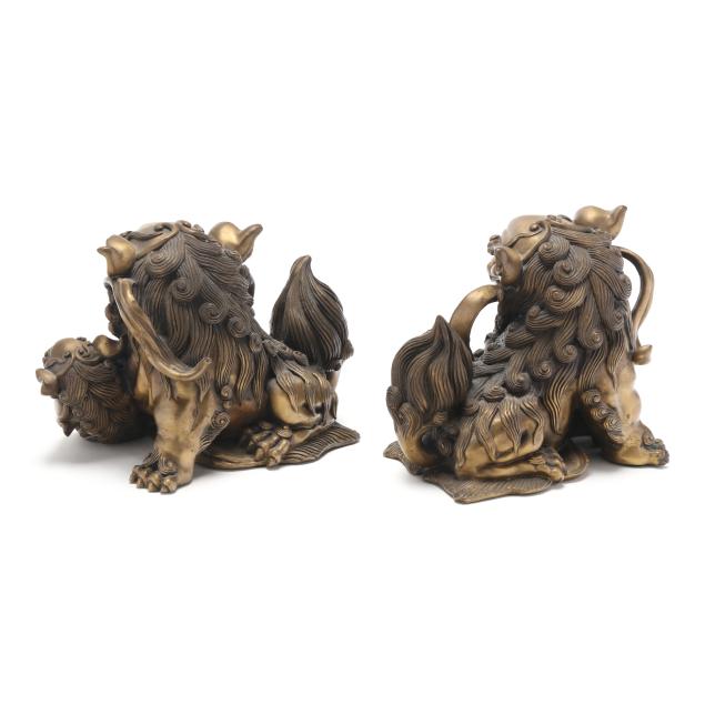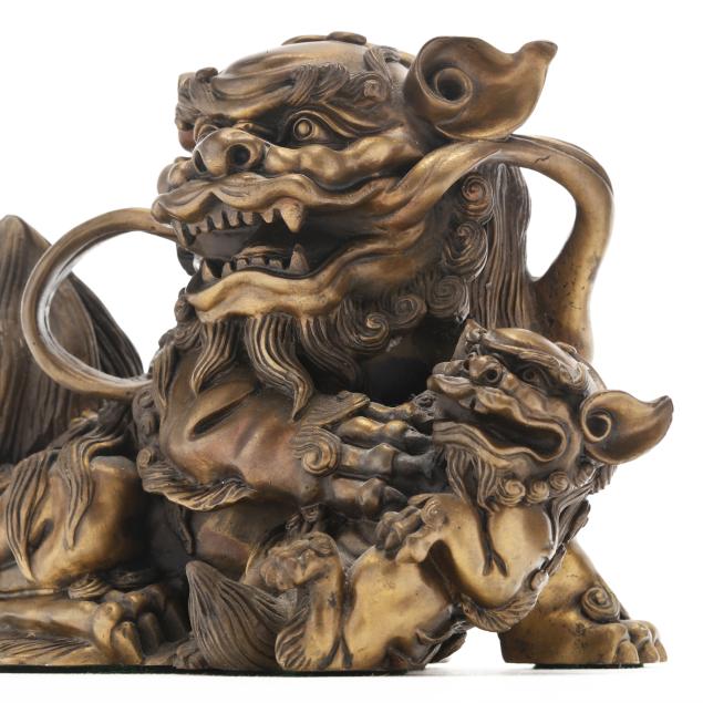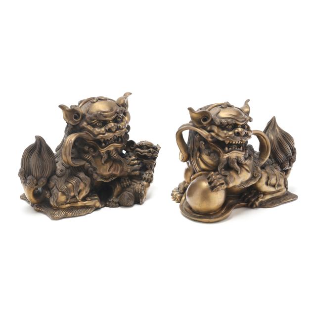 Late 19th century, a pair of well cast guardian foo lions with menacing faces, mouths open showing sharp teeth, ears pushed back, their muscular bodies are seated and the female lion holds a baby under her front paw while the male lion holds a ball, fluffy tuffs to end of tails.