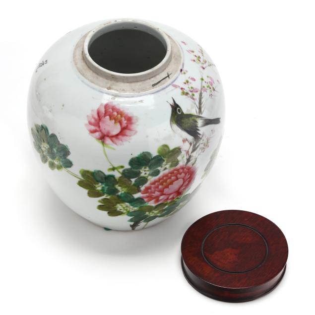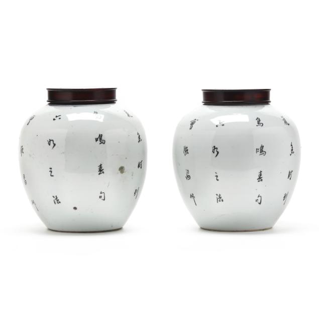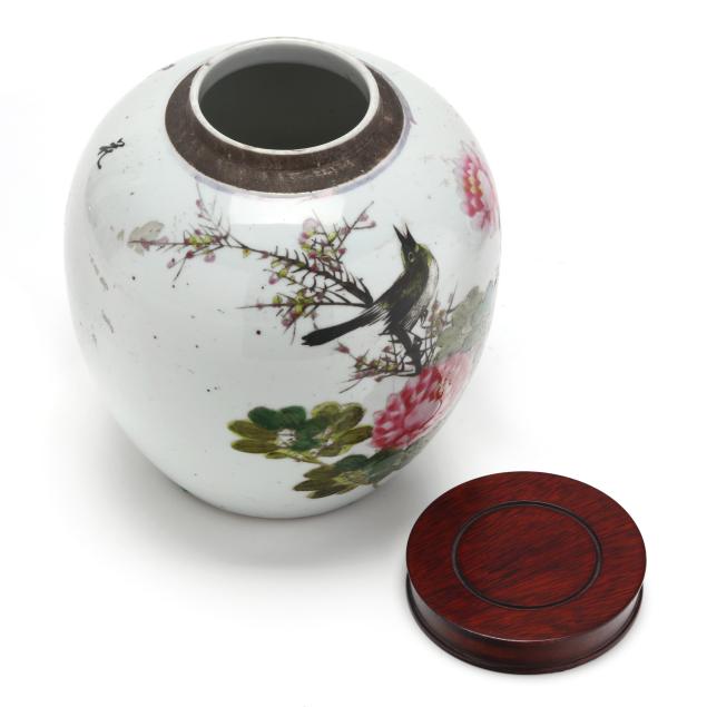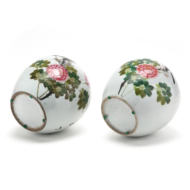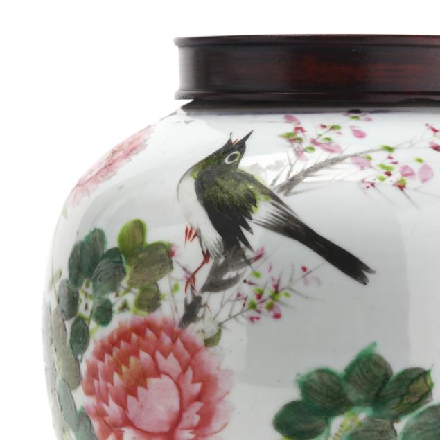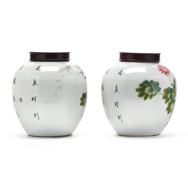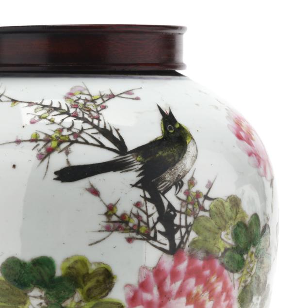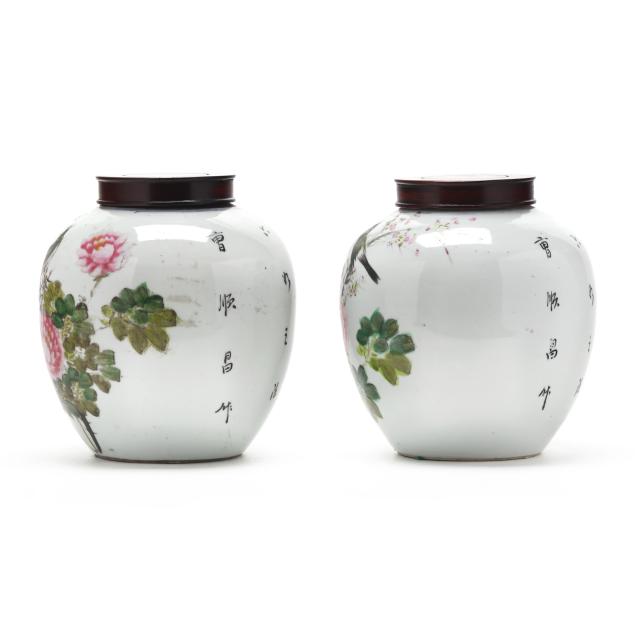 Late 19th century, porcelain globular jars hand painted in mirror decoration with singing birds on a lush pink peony bush, the reverse side with Chinese inscription, unmarked to underside, with later wooden covers.