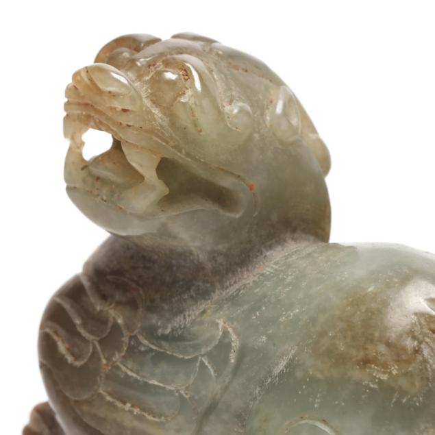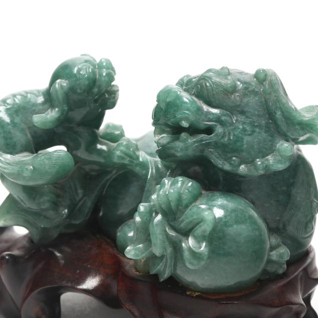 From the Collection of Josephine Chapman Borthwick, Pinehurst, North Carolina Anomalies and striations natural to stone; foo dogs on stand with a few nicks and visible old museum wax to stand.