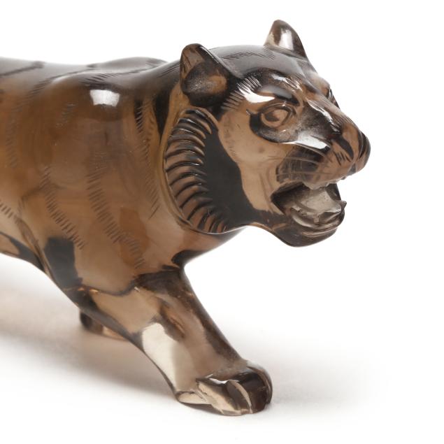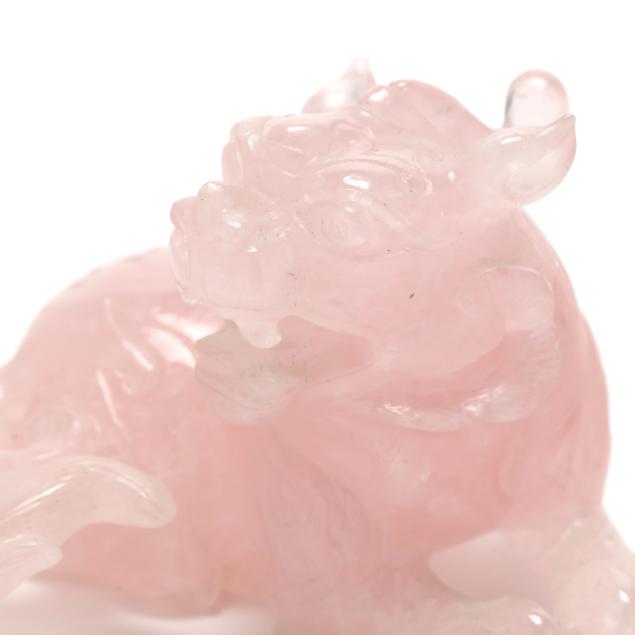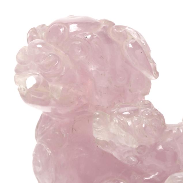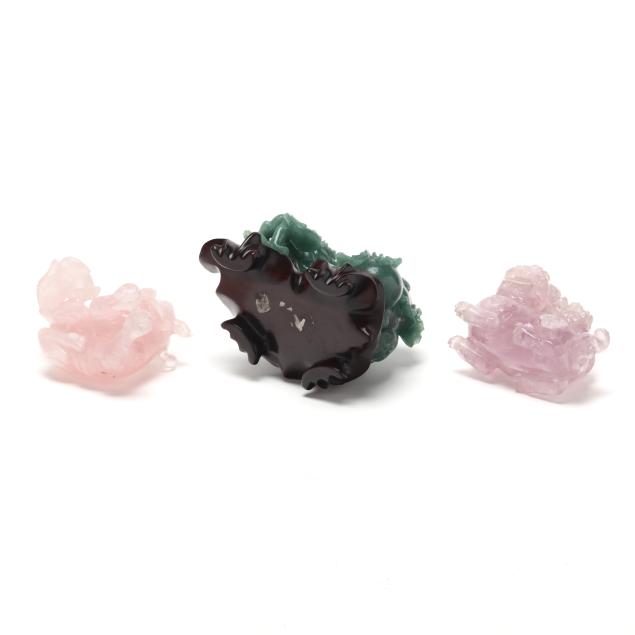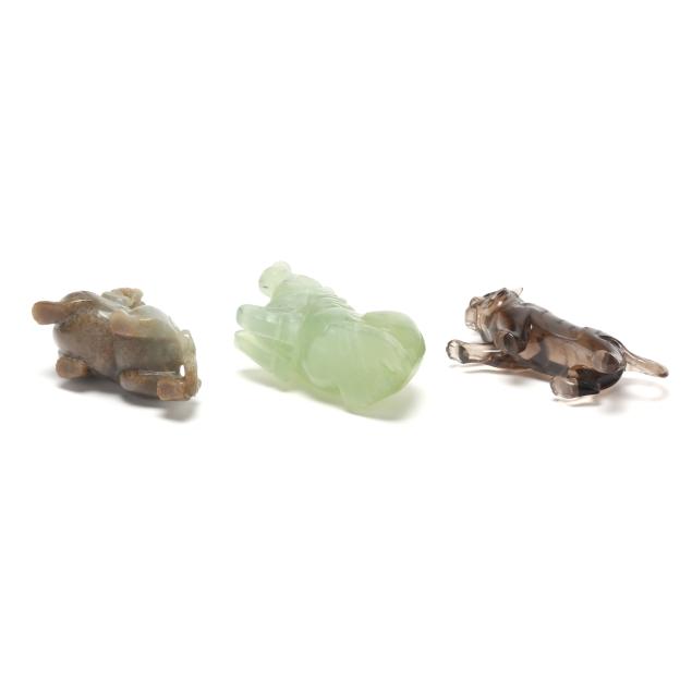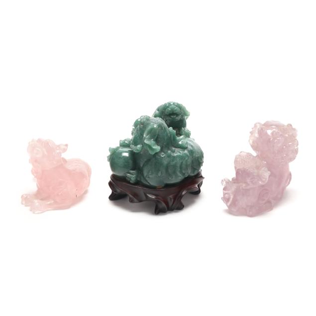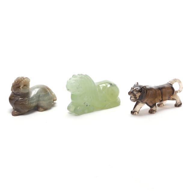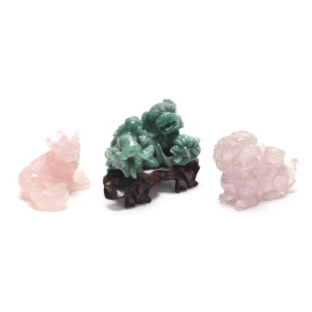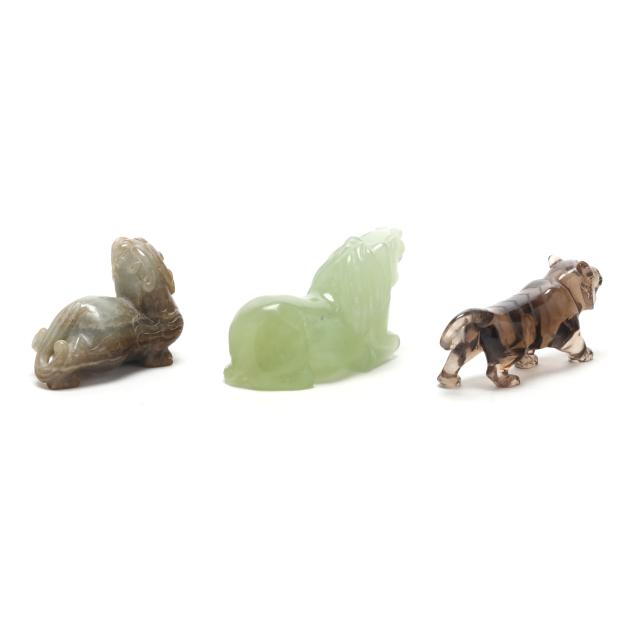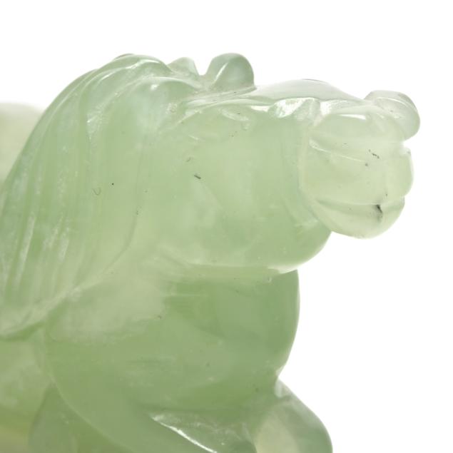Includes two pink stone carvings of foo lions, a spinach green stone carving a mother and baby foo lion together with a carved wooden stand, a mottled stone carving of a chimera, a light celadon green carving of a horse, and a brown colored glass tiger figure.
