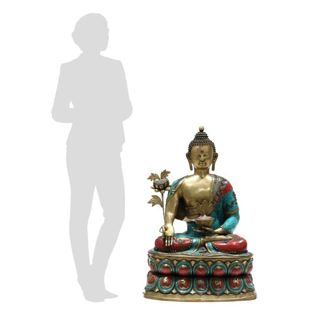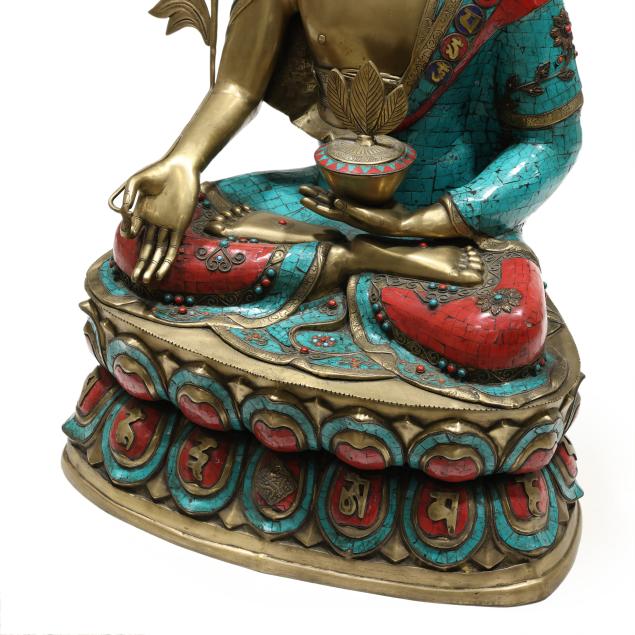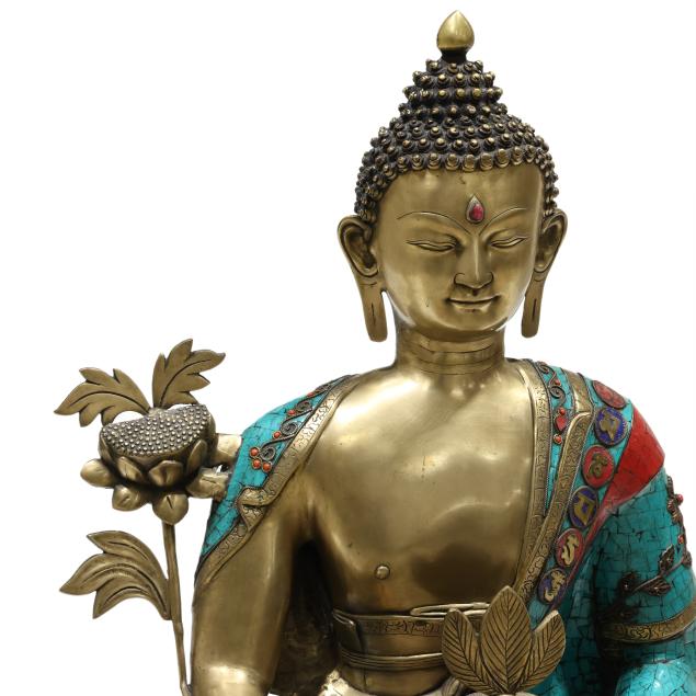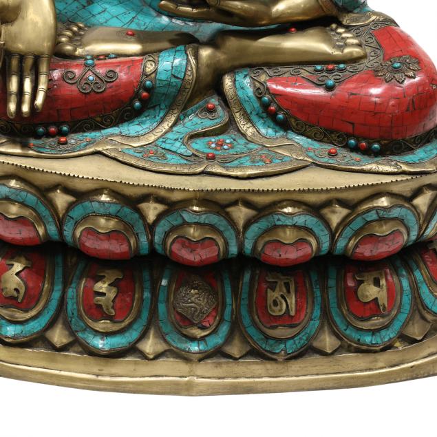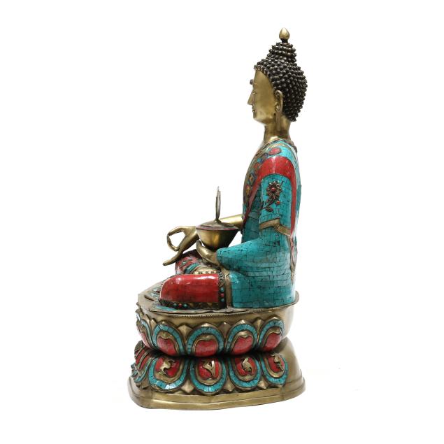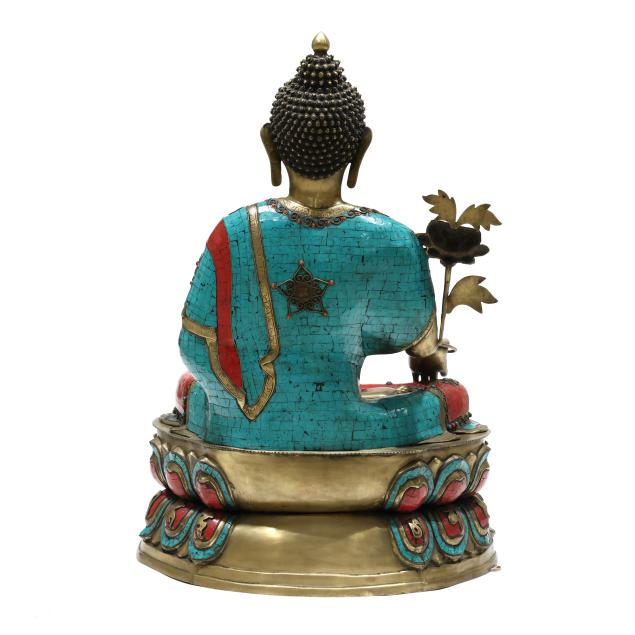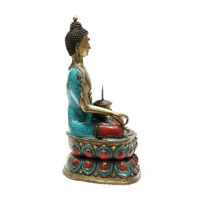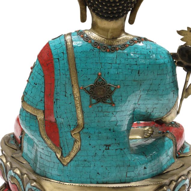 Late 20th century, cast and patinated bronze in one part form with inlaid turquoise and coral colored stones, the seated figure on a lotus form plinth, decorated to all sides.