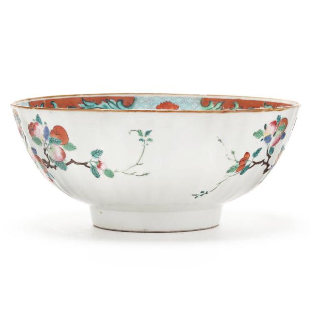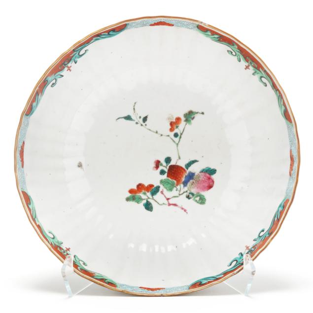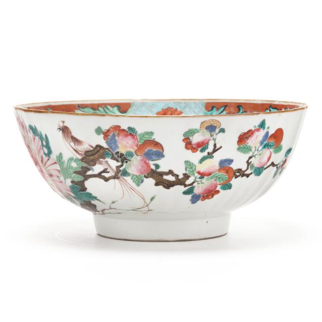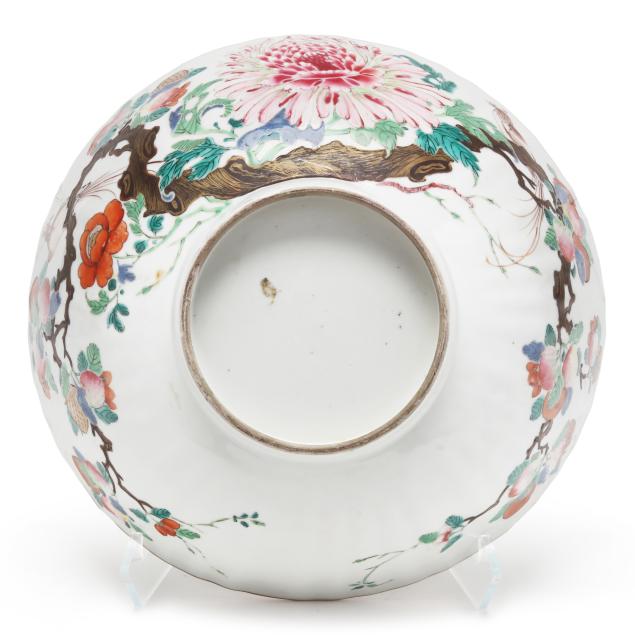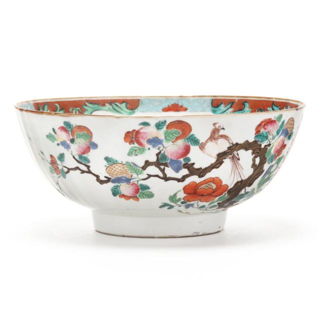 Early 19th century, a porcelain center bowl with iron red and aqua diaper pattern to interior rim border, well with a spray of strawberries and flowers, the exterior sides with a large pink chrysanthemum flanked by a pair of pheasants and fruit, unmarked.