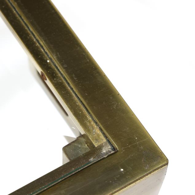 Circa 1970, rectangular beveled glass top, hollow brass frame with stylized Greek key returns, straight legs with applied banding, unmarked.