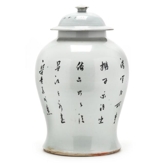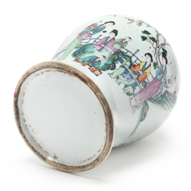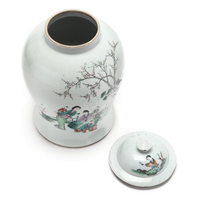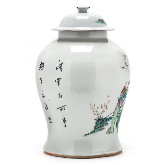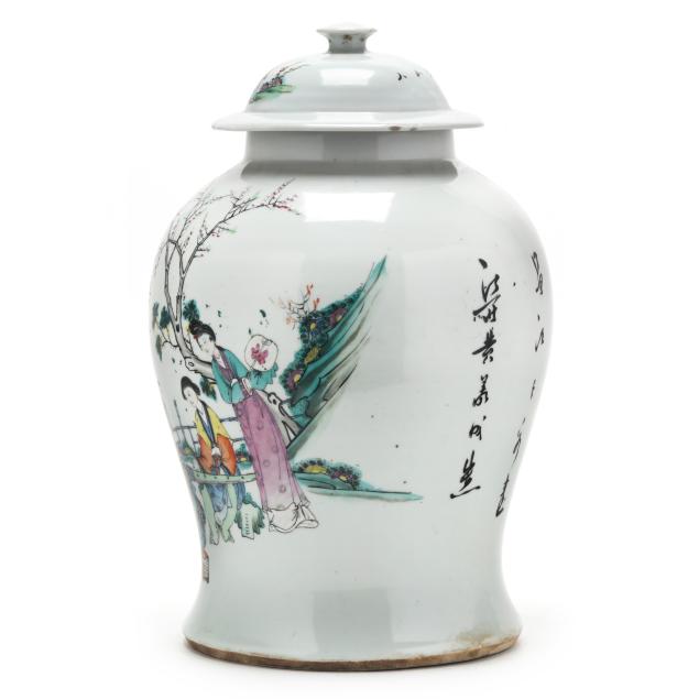Early 20th century, a tall porcelain jar hand painted with elegant ladies engaged in leisure activities together with children in a lush outdoor landscape, the reverse side with a Chinese inscription, the cover with similar decoration, interior rim of cover has a painted inscription with date.