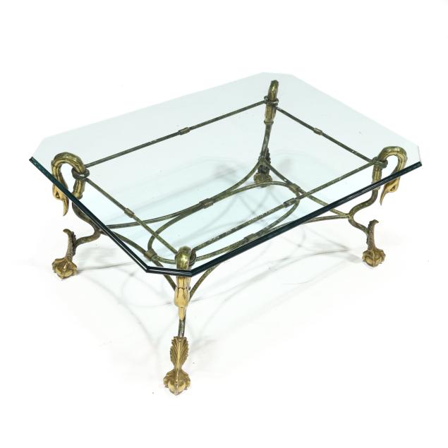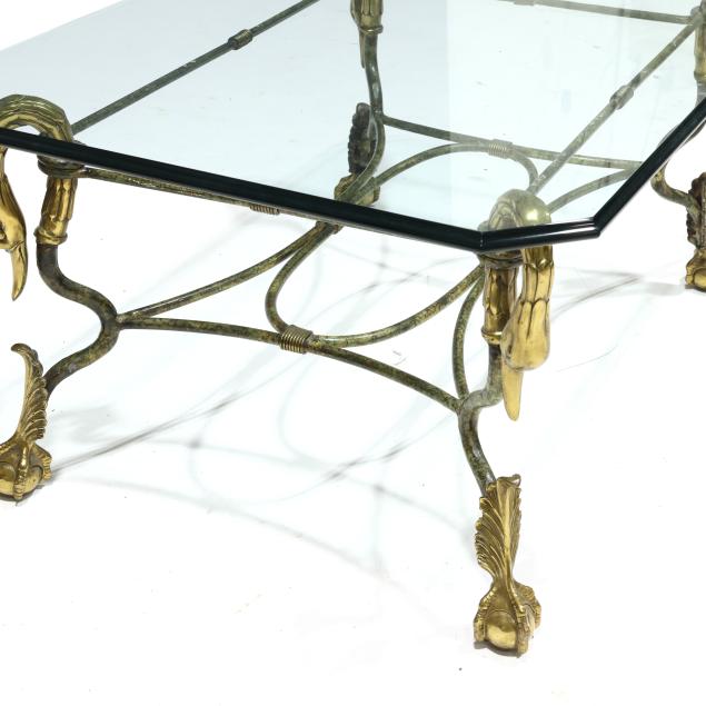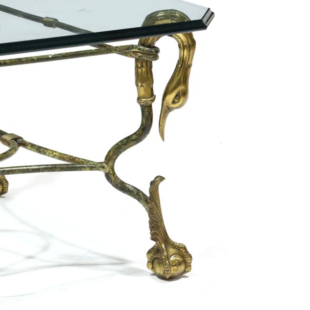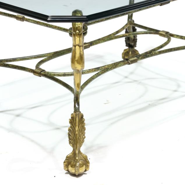 Late 20th century, rectangular glass top with bullnose edge and canted corners, painted iron and brass base with swan neck over ball and claw feet, unmarked.